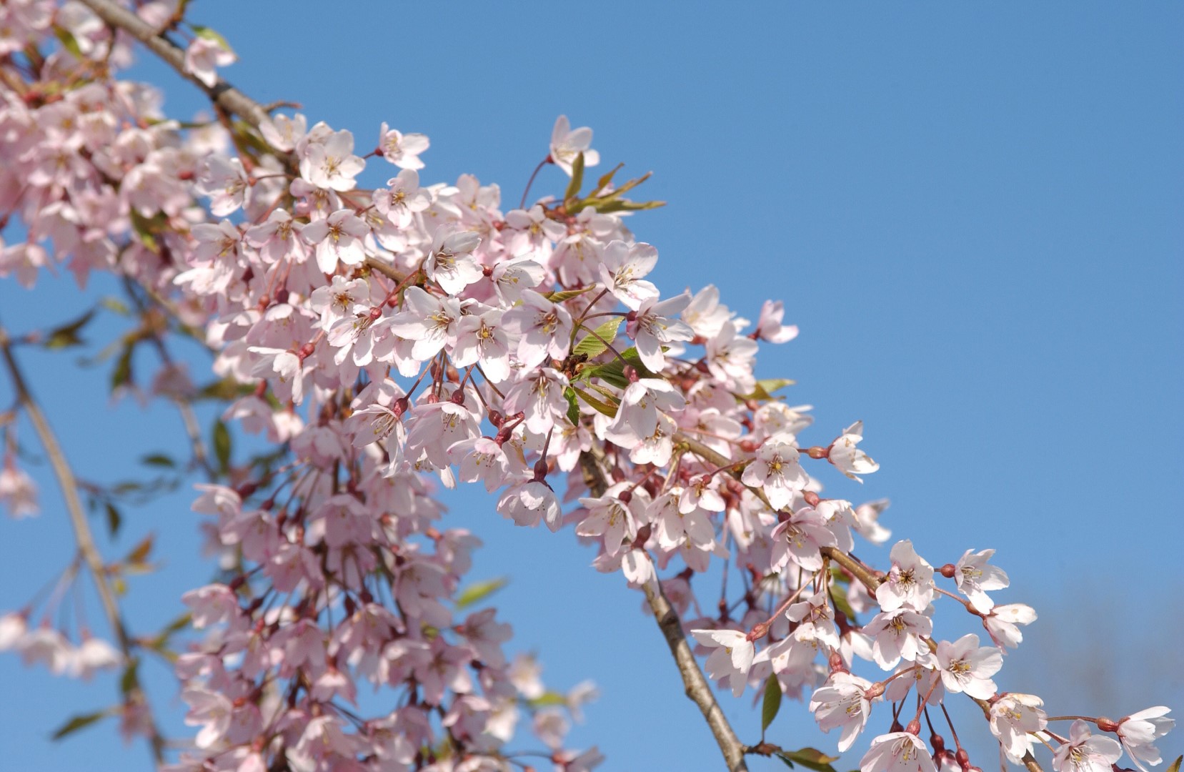 Prunus subhirtella 'Pendula Rubra' Usually grafted on a stem. The main branches spread horizontally while the relatively young twigs are very pendulous. It forms a decorative winter silhouette. It eventually attains a height of approx. 4 m. The green leaves are somewhat longer and narrower than those of the species, their autumnal colour yellow-orange. Produces many flowers from the end of March to early April. The flower buds are dark pink, the flowers bright pink and single. Flower diameter approx. 2 cm. It does not stand up to wet soil. Winter hardiness zone: 5b