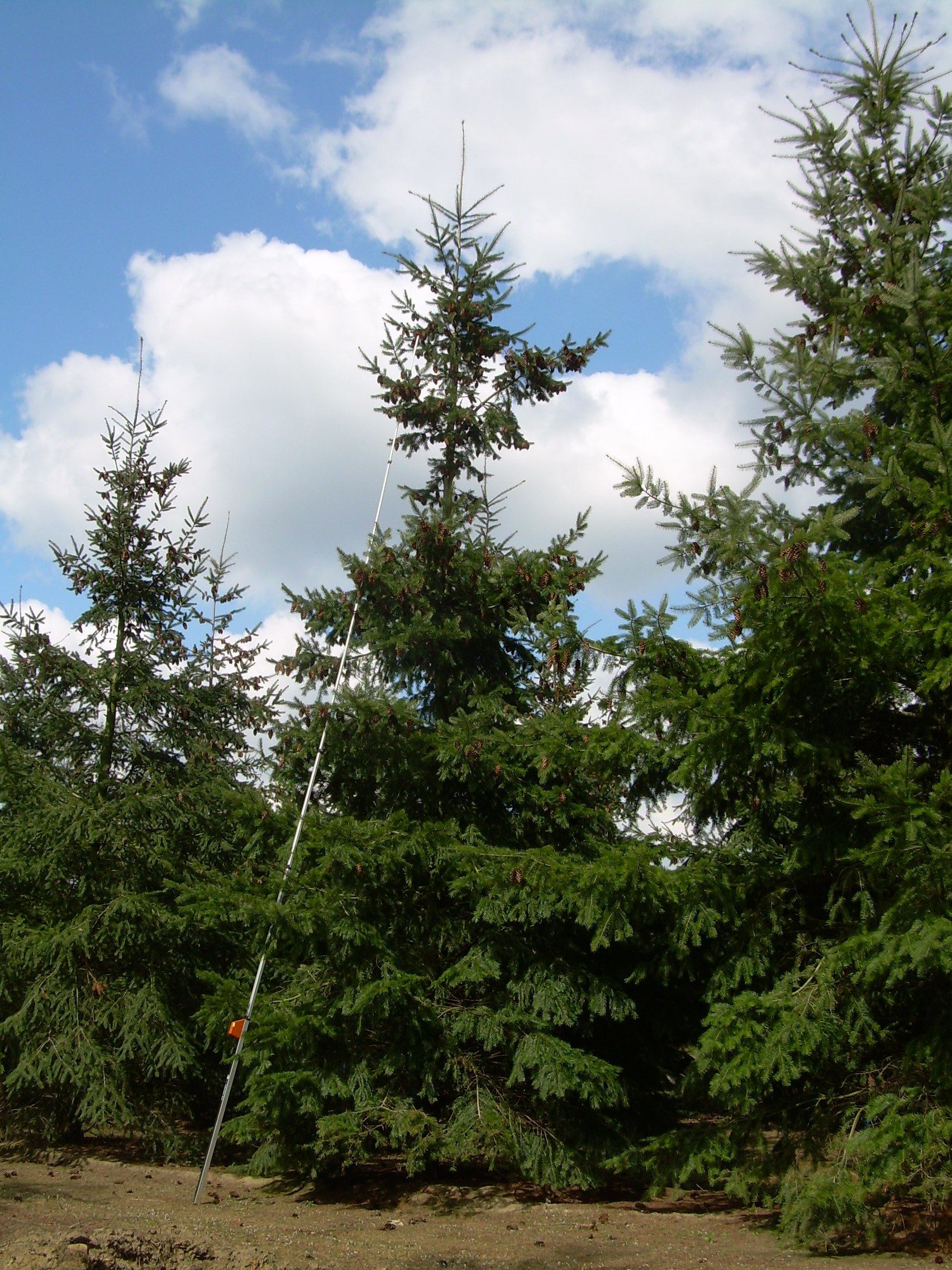 Fast-growing conifer that can reach a height of 100 m in its natural habitat but which remains smaller when cultivated. At first, the crown is broadly pyramidal with an ascending, vertical trunk, but later it becomes oval. The top branches grow vertically: the lower branches hang down. The bark is corky and has deep grooves. Young twigs are yellowish green to yellowish grey and have fine hairs. The top of the protruding needles is dark glossy green: underneath they have 2 white stripes. When rubbed they give off a very fresh smell. Reddish brown, hanging cones are 3 - 3.5 cm thick and up to 10 cm long. The tree is not very demanding when it comes to soil and even grows on poor, dry, sandy soil. It can even survive lengthy periods of drought. The tree is an important supplier of timber. The oldest known specimens are between 500 and 700 years old.