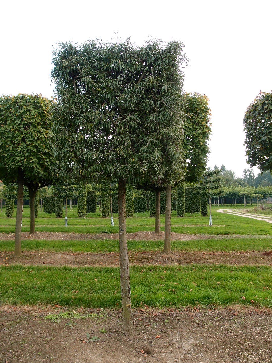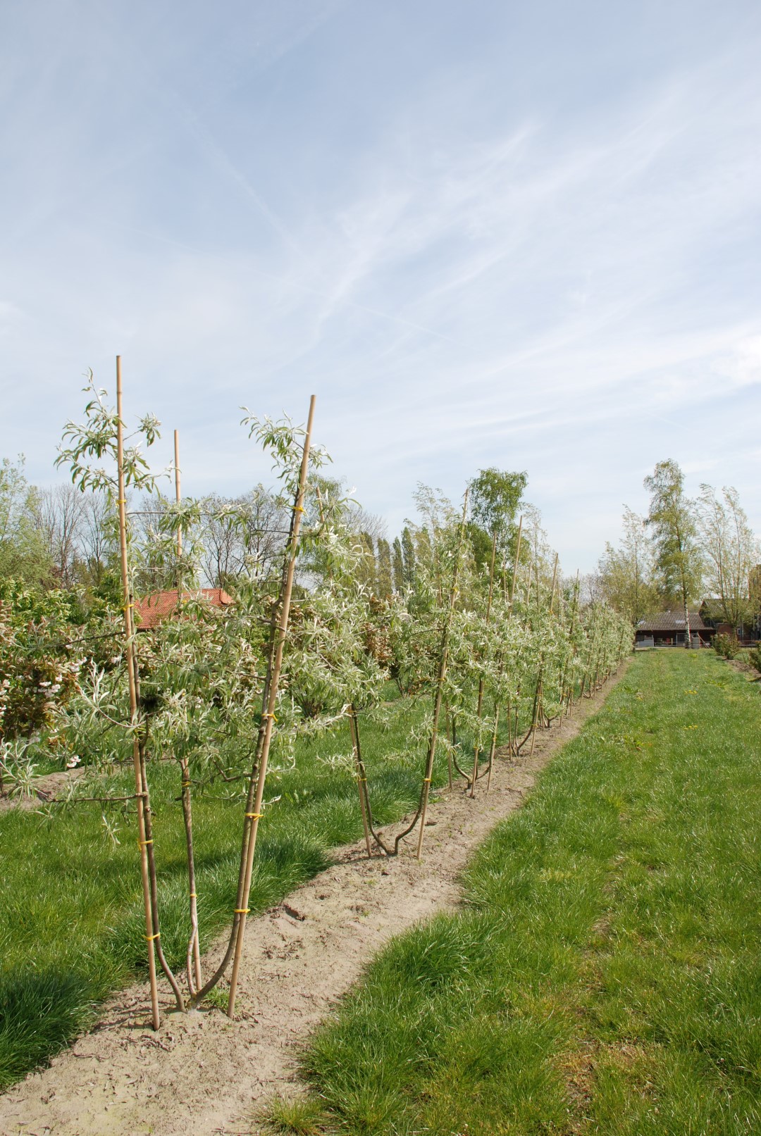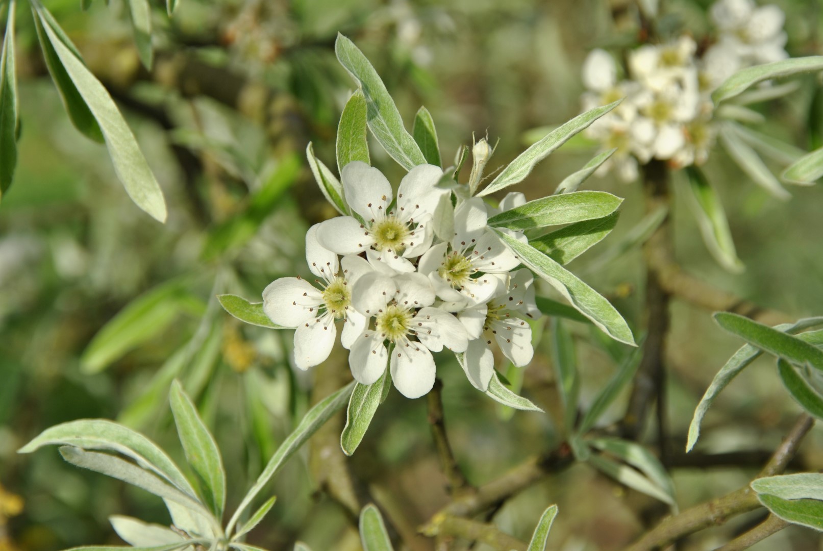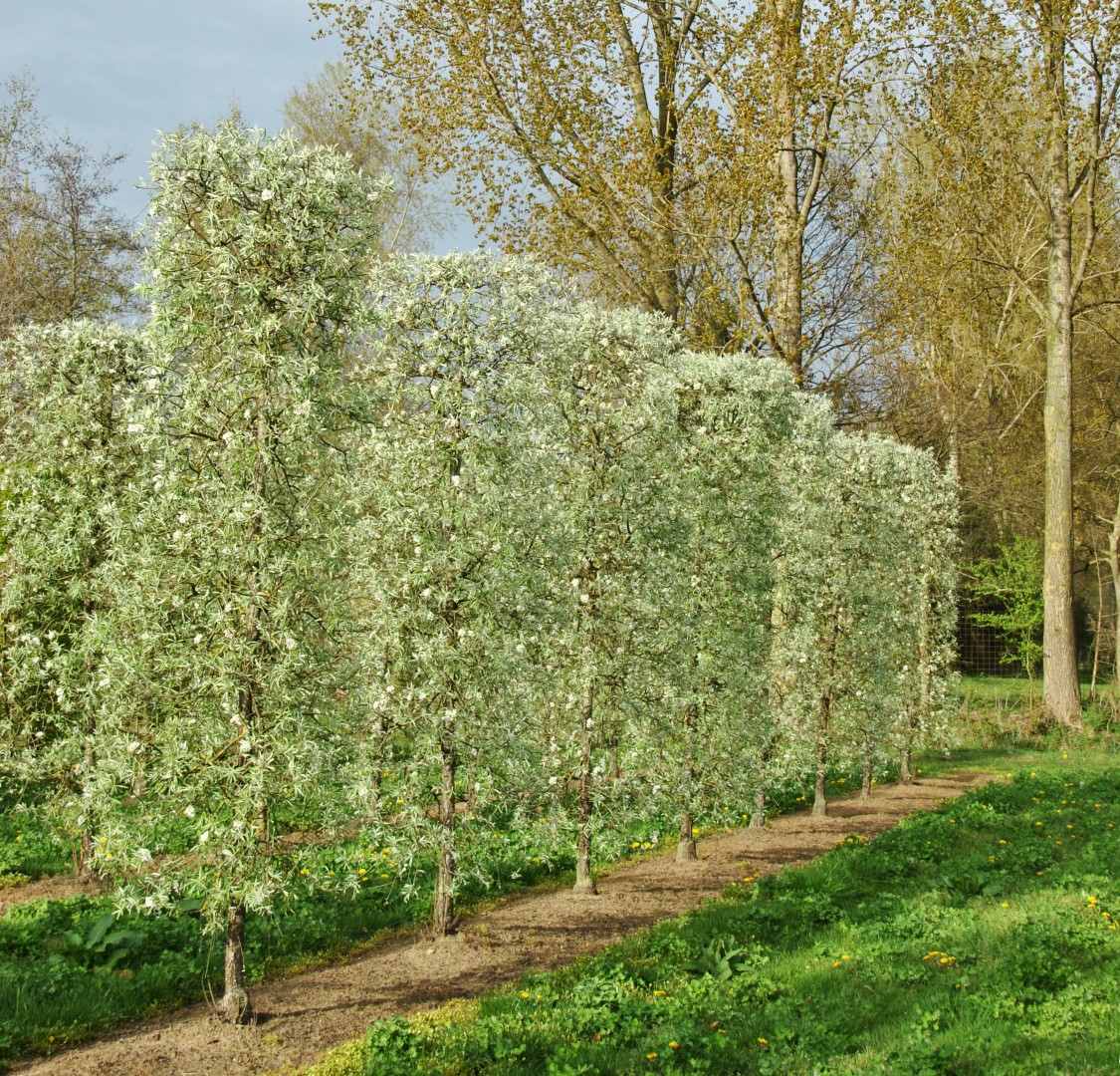 Broadly growing weeping tree with protruding, pendulous branches with thin twigs that grow straight downward. The height is approx 5 -6 m and the tree often grows equally broad. The bark is silvery grey, twigs are lighter grey. Young twigs in particular are slightly hairy. The twigs have irregular thorns. The narrow elliptical to leaceolate leaves are grey-white, later greyish green and have a velvety hair. The underside remains grey-white and practically bare. The leaf is very similar to willow leaves (salicifolia = willow leaf) and remains on the tree until late in the autumn. The creamy white flowers grow in umbels of 6 – 8 together and appear at the same time as the leaves. They do not stand out very well amidst the silvery grey leaves. Places little demands on the soil. Tolerates dry conditions. More weeping manner of growth than the species and thus used more frequently.