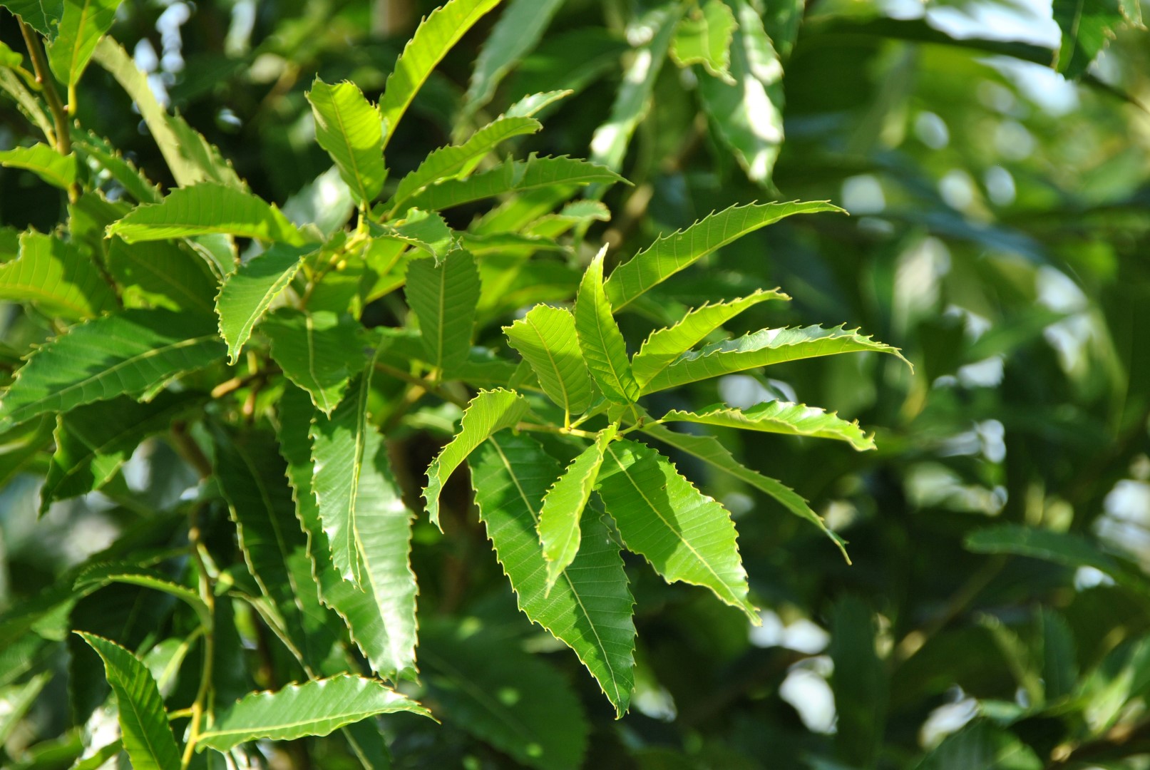 Attains a height of 20 m in its natural habitat but only 6 - 12 m in Europe. Very dense branches grow on a trunk that remains slim. The crown is closed and grows to a broad ovoid shape. Young twigs are angular and very hairy, later bare, and they have lenticels. Reddish-brown buds grow on the greyish-brown twigs. The leaves resemble those of Castanea and are matt glossy and dark green. Their shape is variable, usually elongated to lanceolate. The 10 to 20 lateral veins end along the leaf edge in needle-like serrations. The leaves are 10 - 20 cm long and 2.5 - 6 cm wide. The female flowers are unremarkable: the male flowers grow in catkins 10 - 15 cm long. The acorns are half to two-thirds enclosed in a semi-circular cupule covered with narrow scales.