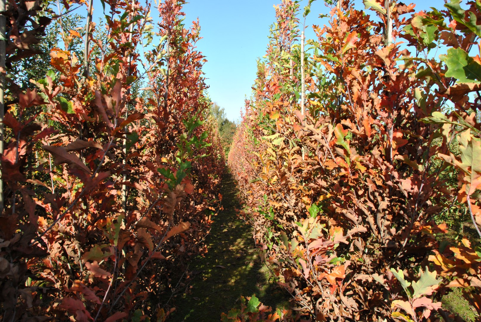 Columnar oak that becomes broader when older, especially at the base of the tree, and gets a narrow, oval crown. The tree eventually grows to about 15 m tall and about 5 m wide. Originated from a cross between Q. alba and Q. robur ‘Fastigiata’. In terms of appearance, the tree has the most characteristics of Q. robur ‘Fastigiata’. The light brown bark is grooved. The leaves are shallow lobed and dark green. The underside is only hairy in the vein axils. In autumn, it turns red to purplish red, a feature that the tree inherited from Q. alba. Its high resistance to mildew also comes from its American parent. The combination of a narrow crown, healthy leaf and a beautiful autumn colour makes ’Crimschmidt’ a widely useful avenue and street tree. Was introduced to the market by J. Frank Schmidt & Son, Boring, Oregon, USA.