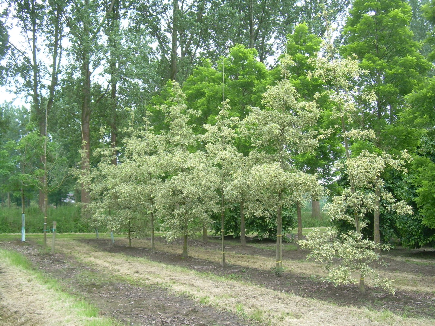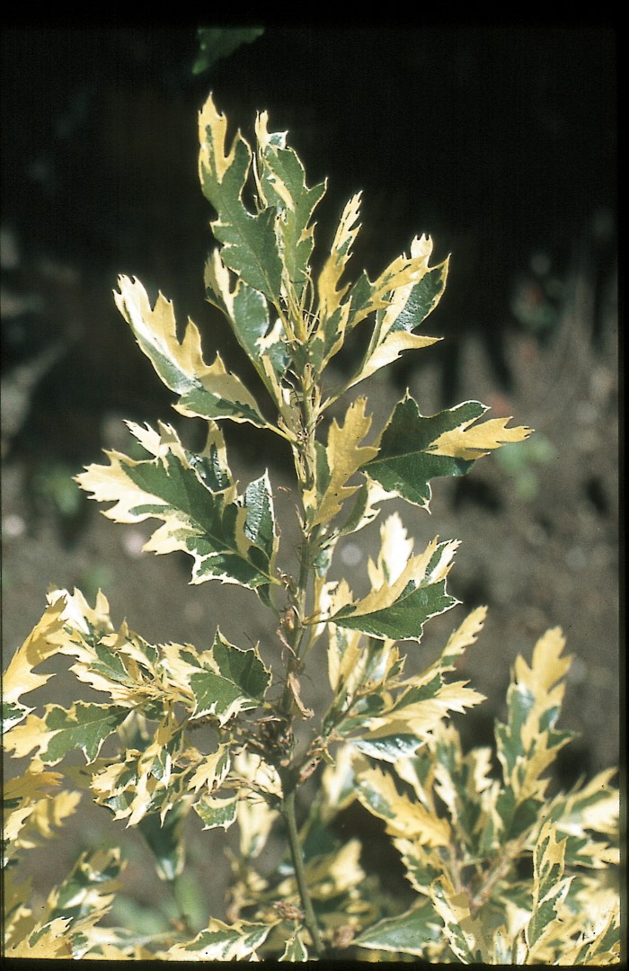 A sturdy tree with a broad, spherical, later rounded crown usually with an ascending main trunk with heavy crown branches. The trunk is roughly grooved with long bark plates. Young twigs are greyish and felt-like, angular at the top. The buds have downy hairs and moss-like stipules. The leathery leaves vary in shape, usually elongated to oval. They are rough on the upper side, bare on the underside, and have 4 to 9 shallow to very deep lobes. 'Argenteovariegata' is distinguished from the species in that its leaves have a wide, irregular, cream-coloured edge. Sometimes creamy patches occur or the creamy-white edge extends to the central vein. The leaves remain on the tree until deep into winter. The fruits are the same as those of the species. Sensitive to cracks caused by frost but insensitive to mildew.