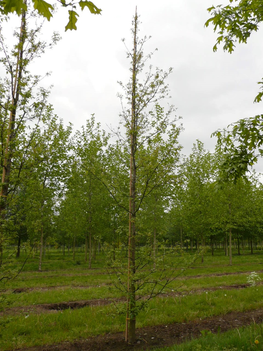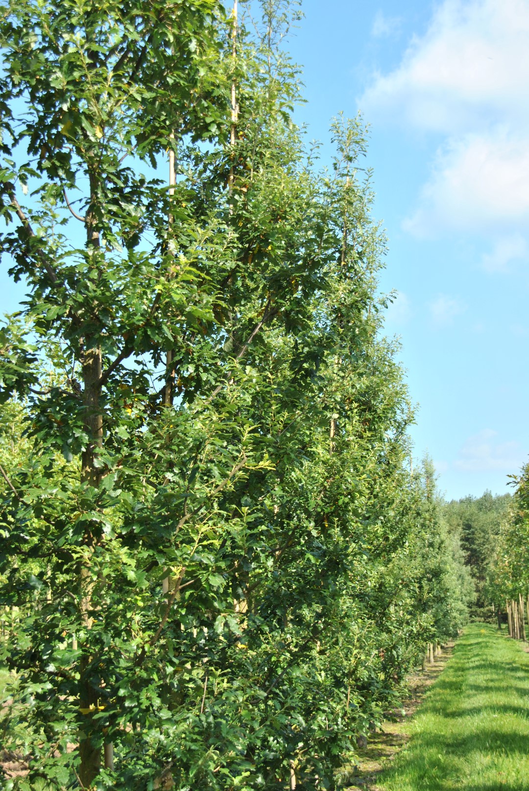 Medium-size tree with a strong growth and an upright central leader. ‘Marvellous’ forms a regular pyramidal tree that spreads later. The bark is like the species, almost black and roughly grooved. The young twigs are grey and felt-like and bear light green leaves. The summer leaves are glossy dark green with pointed lobes like the species. The tree keeps its leaf until the first frost. Its regular form makes it suitable for lanes, wide green borders and verges. A very wind resistant and healthy tree. Q. cerris can also be used in industrial areas.
