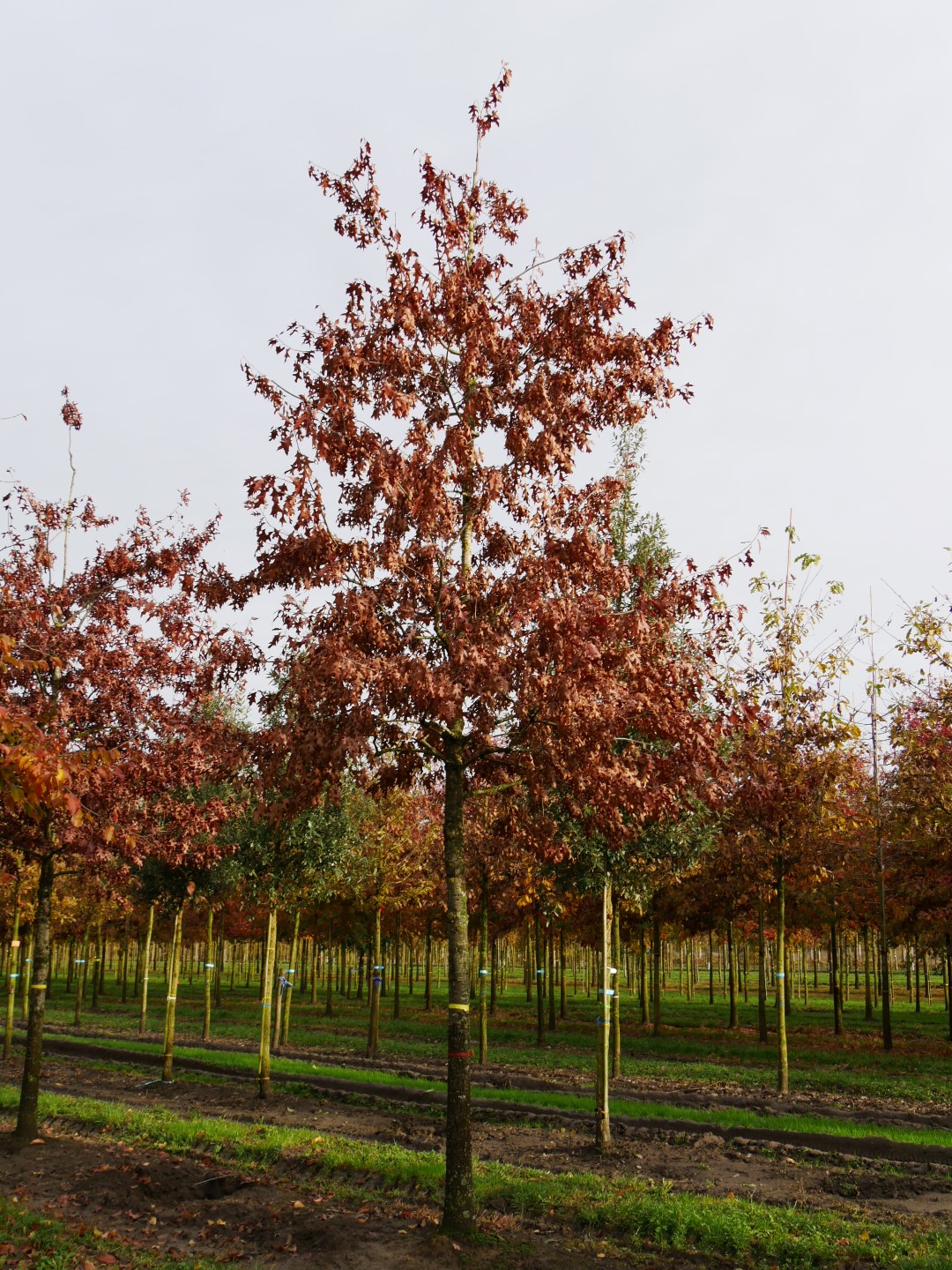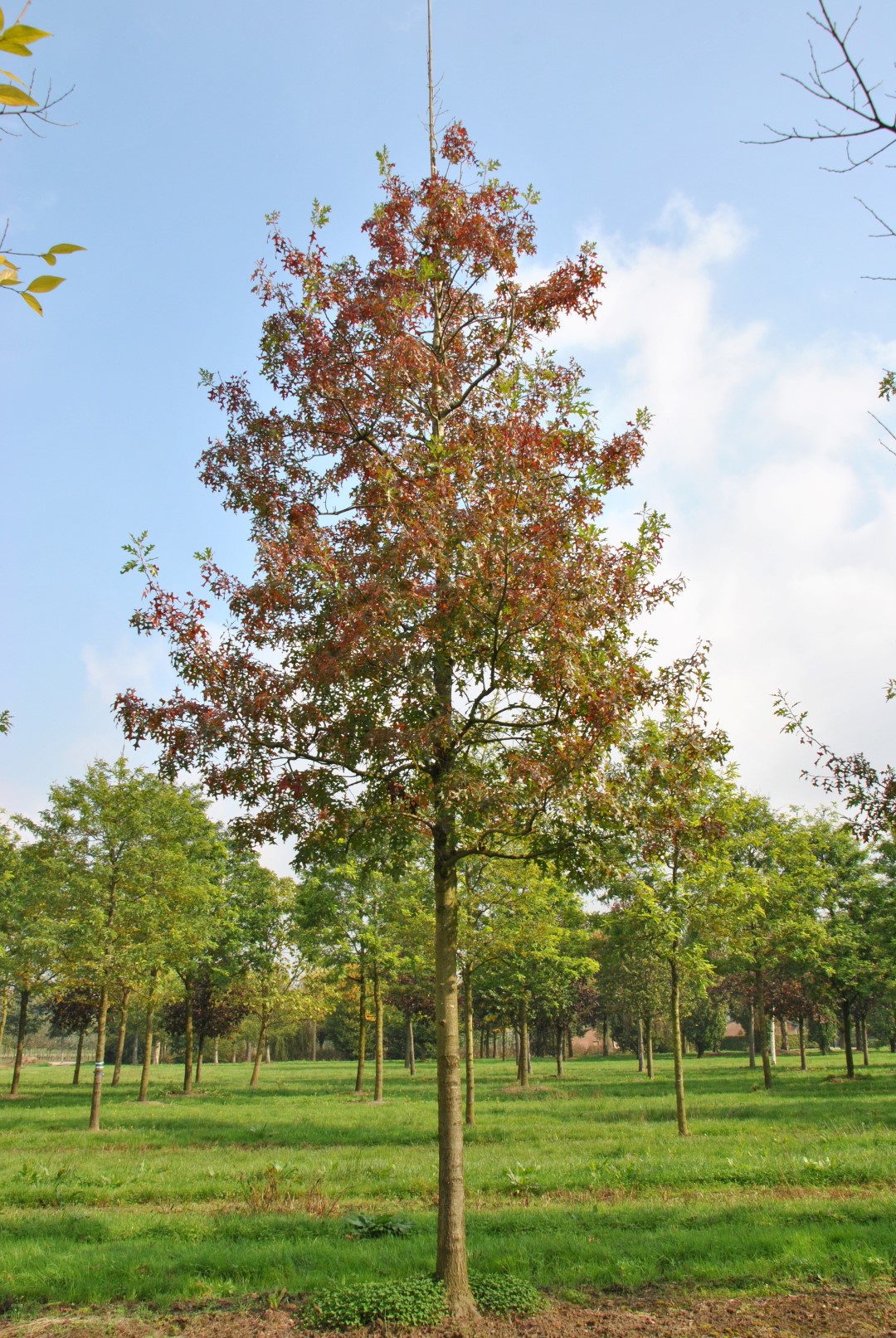 An oak tree that bears a strong resemblance to Q. palustris, occurring in the wild in the north-east of North America. There it forms a large tree with a broad ovoid crown up to approx. 25 m in height. Cultivated specimens are no taller than approx. 15 m. The shallow grooves in the grey bark are yellow. For this reason the tree is also known as “Yellow oak”. The ovoid leaf is deep pinnately lobed. The lobes are pointed and carry sharp serrations. The leaves are bright green, light green on the underside turning to deep purple in the autumn. The acorns, 1 - 2 cm in size, are elliptical and are one-third to half enclosed by the cupule. This is what most distinguishes it from Q. palustris that has rounded to flattened acorns one-third to a quarter enclosed in the cupule.