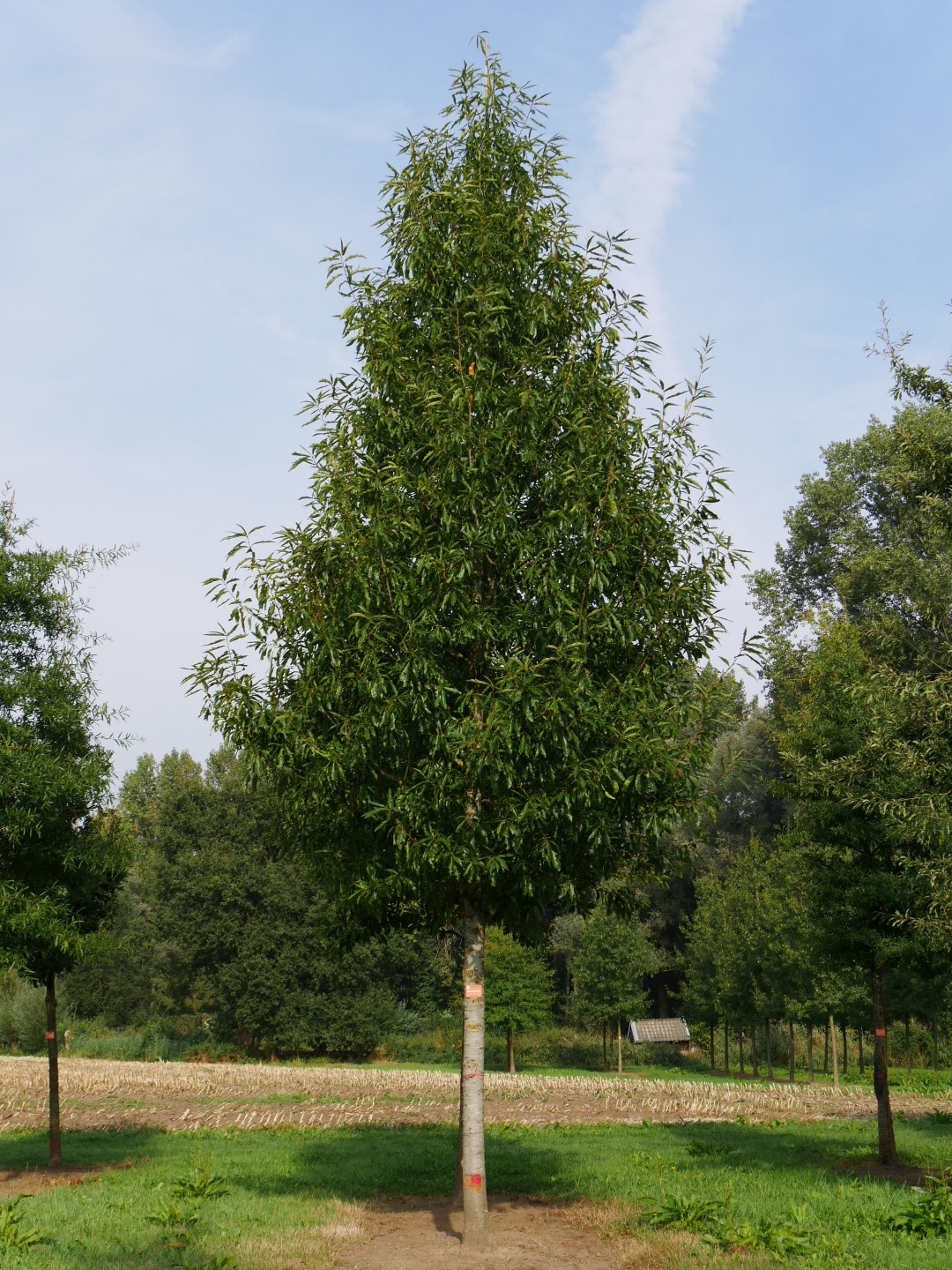 Natural hybrid between Q. phellos and Q. rubra that occurs in places where both species are found. Forms a large deciduous tree with an ovate to round crown growing to around 20 m. The bark is grey and smooth until it is quite old. The bark only gets slightly rough on older trees. The leaf shapes vary greatly from lanceolate to oval. It is usually at its widest above its middle. It is either smooth-edged or has 3 to 5 teeth per side. The top of the leaf is glossy green and bare. The underside is lighter and only hairy in the vein axils. In autumn, the leaf turns reddish to reddish brown. It produces only a few acorns which look like the ones on Q. rubra. A healthy, hardy tree that thrives on less fertile soil, provided it is moist enough and not too limy.
