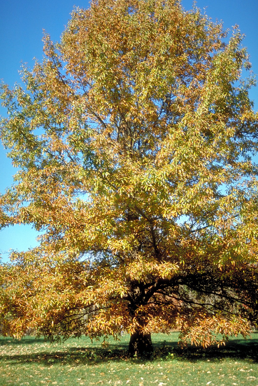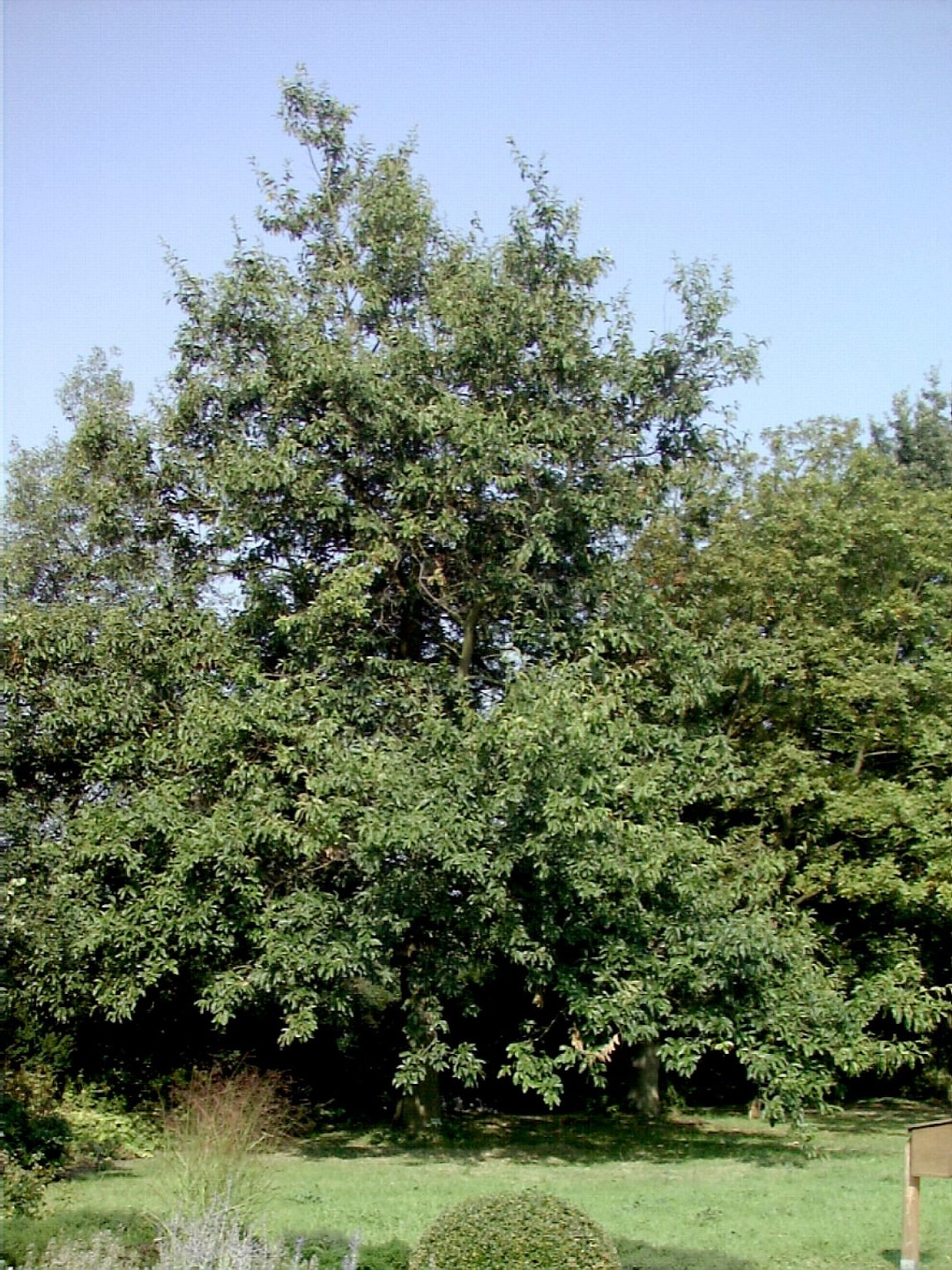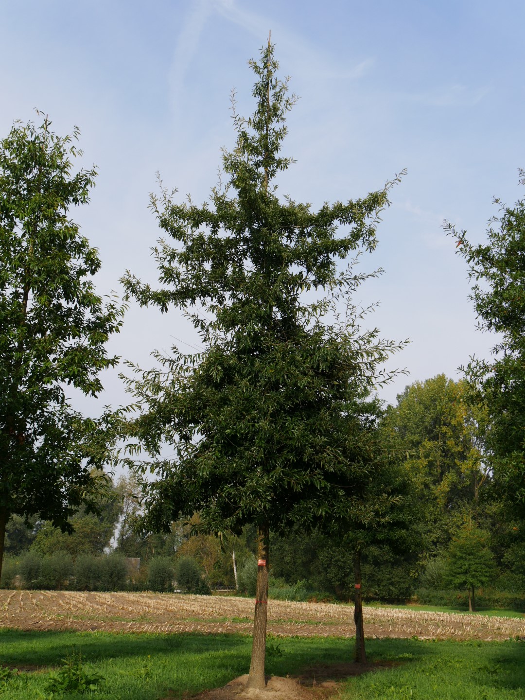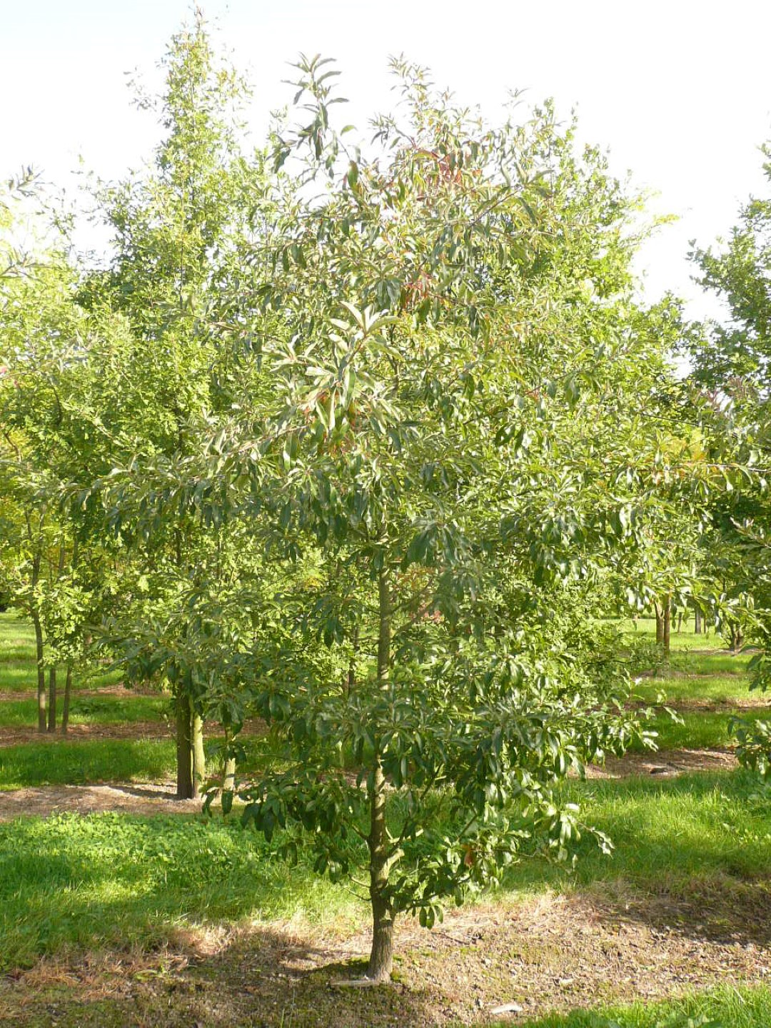 Young specimens of this handsomely shaped tree start out with a pyramidal crown which later becomes almost round. The trunk remains smooth for many years: only in older specimens does the bark become somewhat rough and grooved. Young twigs are bare and light brown. The leaves are elongated oval, 7 - 17 cm long and 2.5 -5 cm wide. They have a smooth and slightly undulating edge. On the upper side they are glossy dark green, on the underside light green and covered with grey hairs. The brownish-red central vein is a remarkable feature. In the autumn the leaves turn yellowish-brown. The acorns are single or in pairs and are half enclosed by the cupule. The latter is thickly covered with small, contiguous, reddish-brown scales. Q. imbricaria is one of the finest oaks for use in parks and is particularly remarkable for its exceptional leaf shape. In earlier times the wood of the trunk of Quercus imbricaria was made to make roof tiles (shingles). The Latin word for 'rainstorm' (imber) appears in its name.