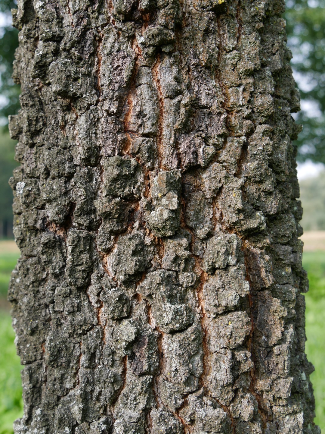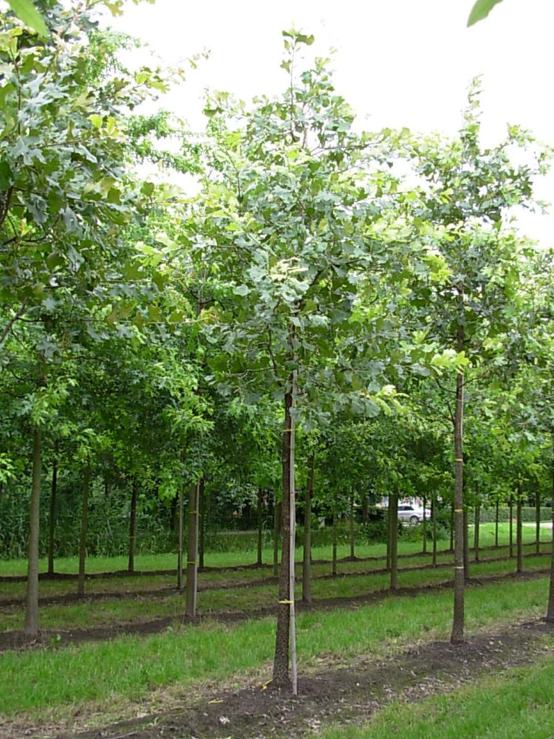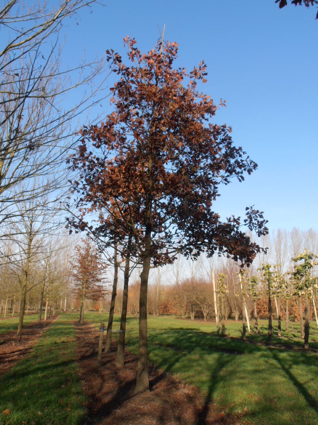 Medium-size tree with a somewhat ragged, irregular, flat-topped spherical crown. The young twigs are olive green, slightly reddish on the sunny side and later grey. The old bark is dark grey to almost black and smooth to slightly grooved. On older trees the bark has block-shaped grooves. The very strikingly shaped leaves are obovate to inverted triangular. The top is 3-lobed and the margins are smooth to shallow-lobed on the upper half. In summer the leaf is glossy dark green turning yellow-brown to yellow in autumn. The ovoid acorns are 1 to 2 cm long and semi-enclosed by the cupule. The cupule is covered with short, hairy scales and the upper edge is typically rolled inwards. A striking park tree, especially thanks to the characteristically shaped leaf. Grows naturally on the most infertile soils and so remains more shrub-shaped. Tolerates warmth well.