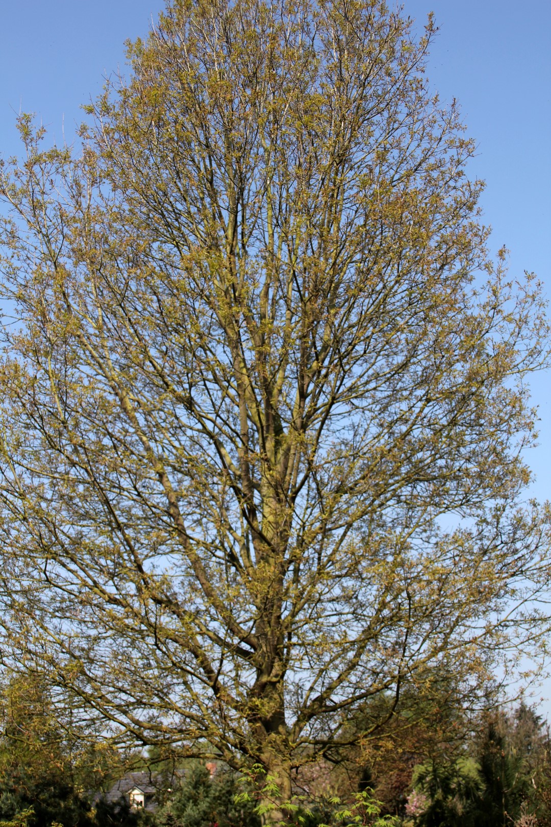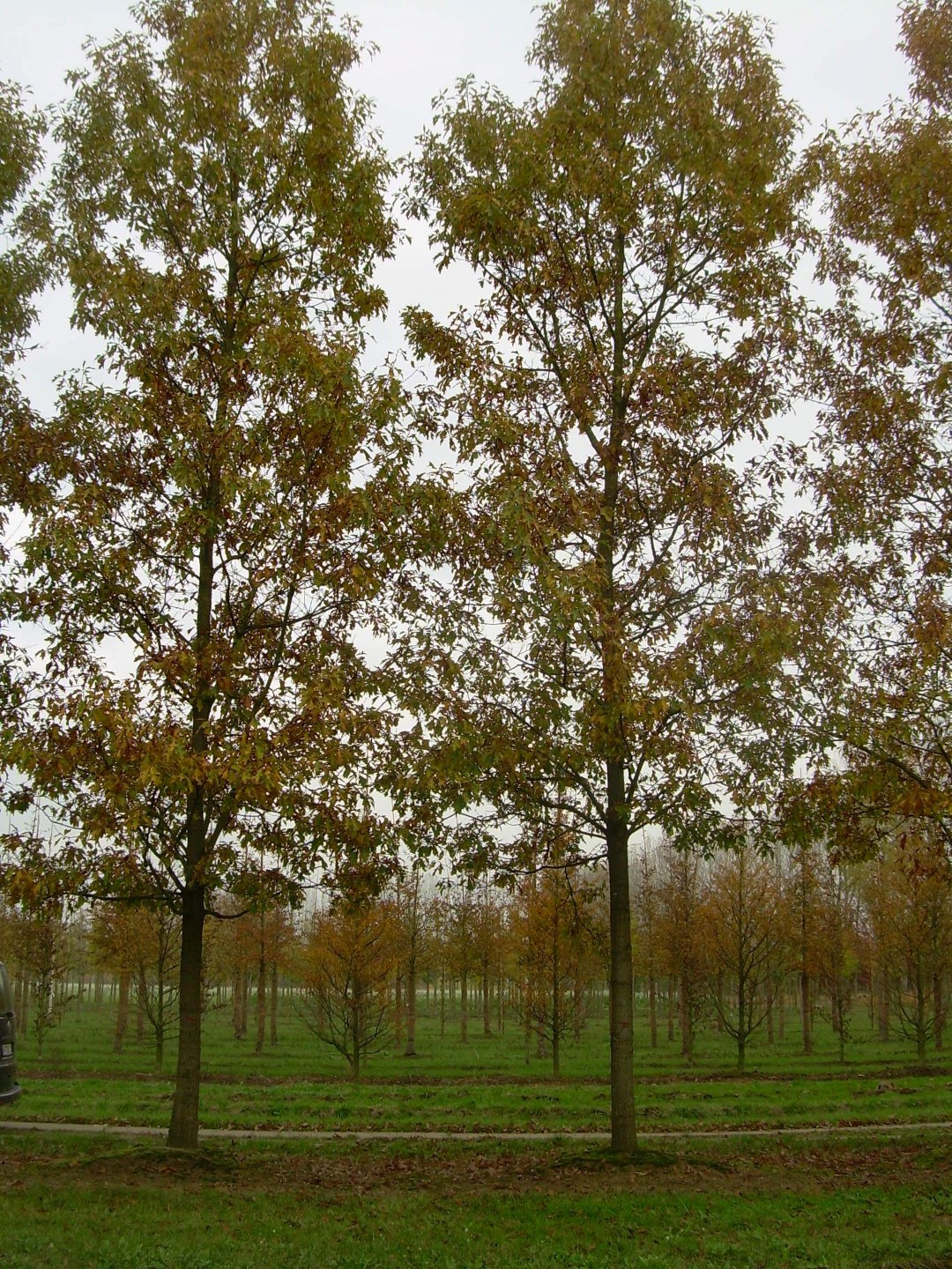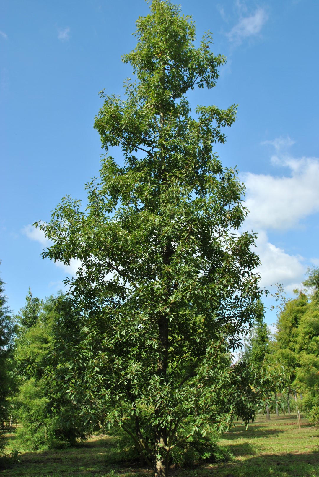 The 'Mauri' cutlivar is a cross between Q. rubra and Q. coccinea or Q. palustris. It grows to a narrow pyramidal shape and attains a height of 20 - 25 m width at a breadth of 5 - 7 m. The grey bark remains smooth for a long time: older trunks develop dark grey bark plates. The young twigs are bare and glossy reddish-brown. The leaves are oval to obovate and are incised up a maximum of halfway. Usually with 6 to 8 rough lobes, triangular and sharply serrated. The leaves are 8 - 16 cm long and 10 - 15 cm wide. Depending on the amount of sun and the temperature the tree turns scarlet red in the autumn. Fallen leaves do not rot easily. The cylindrical flattened acorns are 1.5 – 2 cm in size and are one third enclosed in the cupule.