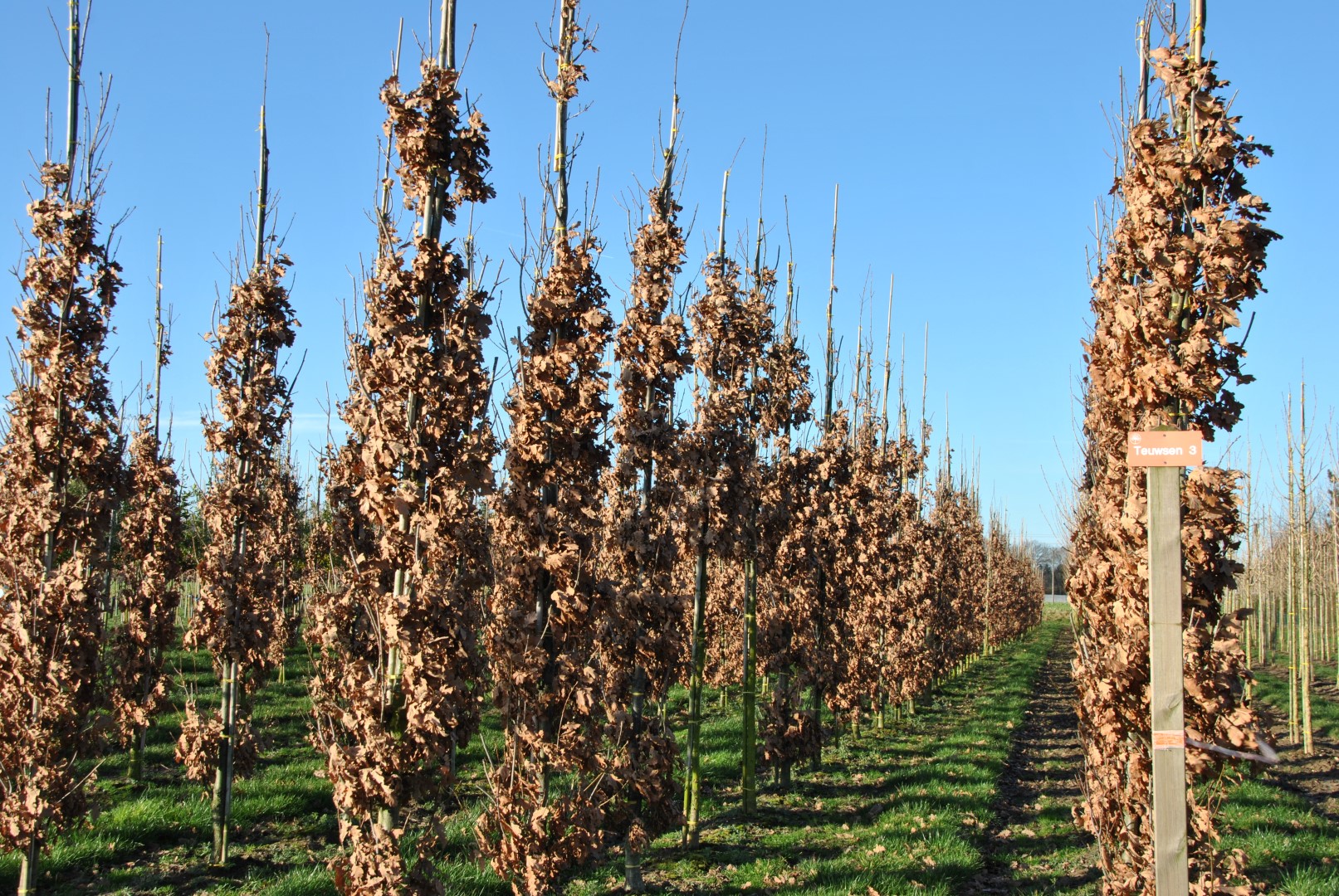 Fine columnar tree that keeps its tight, narrow crown even when older. The tree has a very uniform crown up to a height of 12 to 18 m and does not get wider than 3.5 to 4.5 m. As the branches project from the trunk at an angle of 20° - 25°, the narrow habit is retained. The branching is dense and the young twigs are olive green. The older branches and the bark are grey. The bark is smooth to shallow grooved. The roughly lobed leaf is glossy dark green, turning red to reddish brown in autumn. In winter the tree holds on to quite a lot of withered foliage. Was found as a seedling of Q. palustris ‘Crownright’. Its columnar growth habit makes it very suitable for use in narrow streets, in residential areas and squares. Grows best on fairly acidic soil and can also cope with wet soil. Can tolerate air pollution.