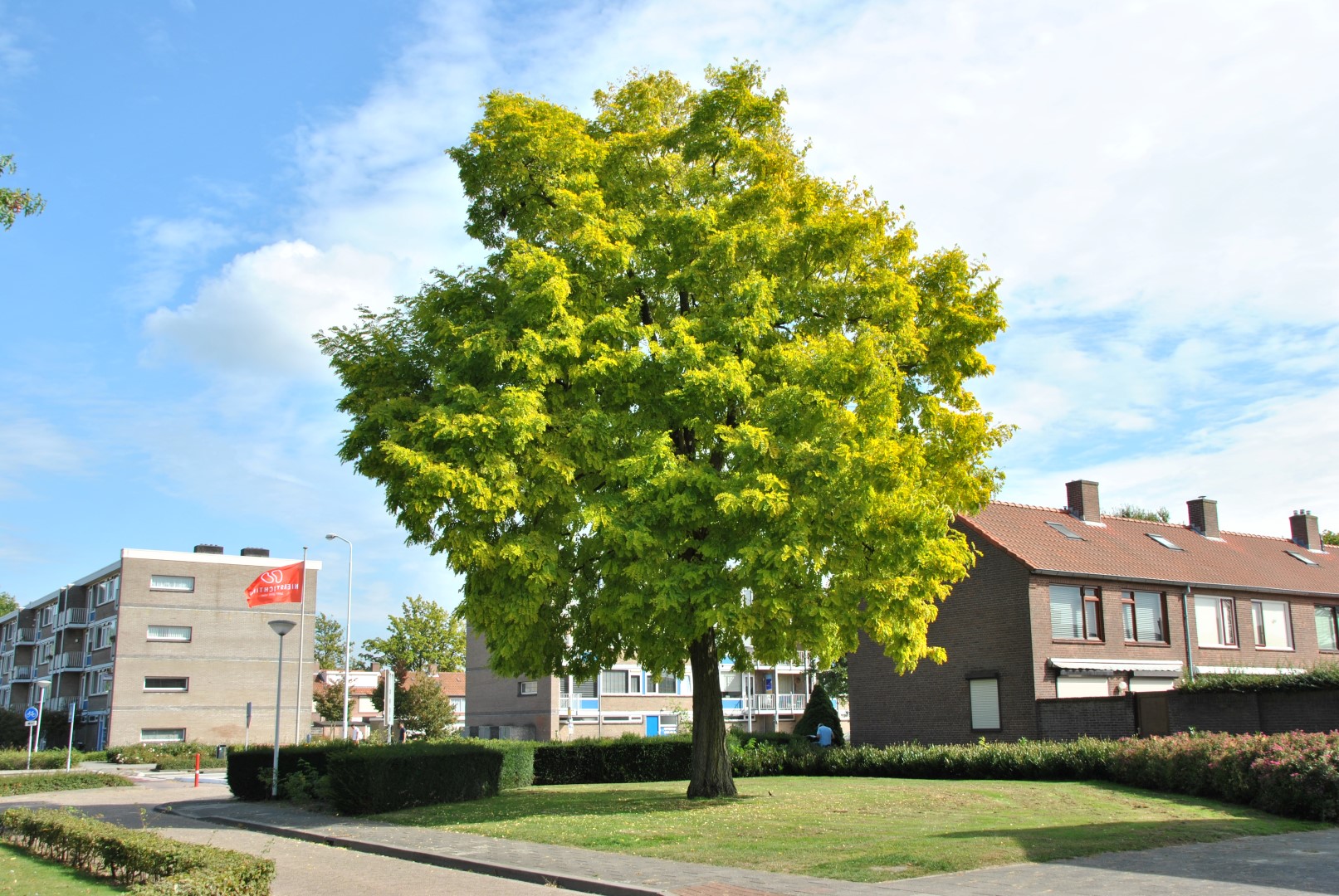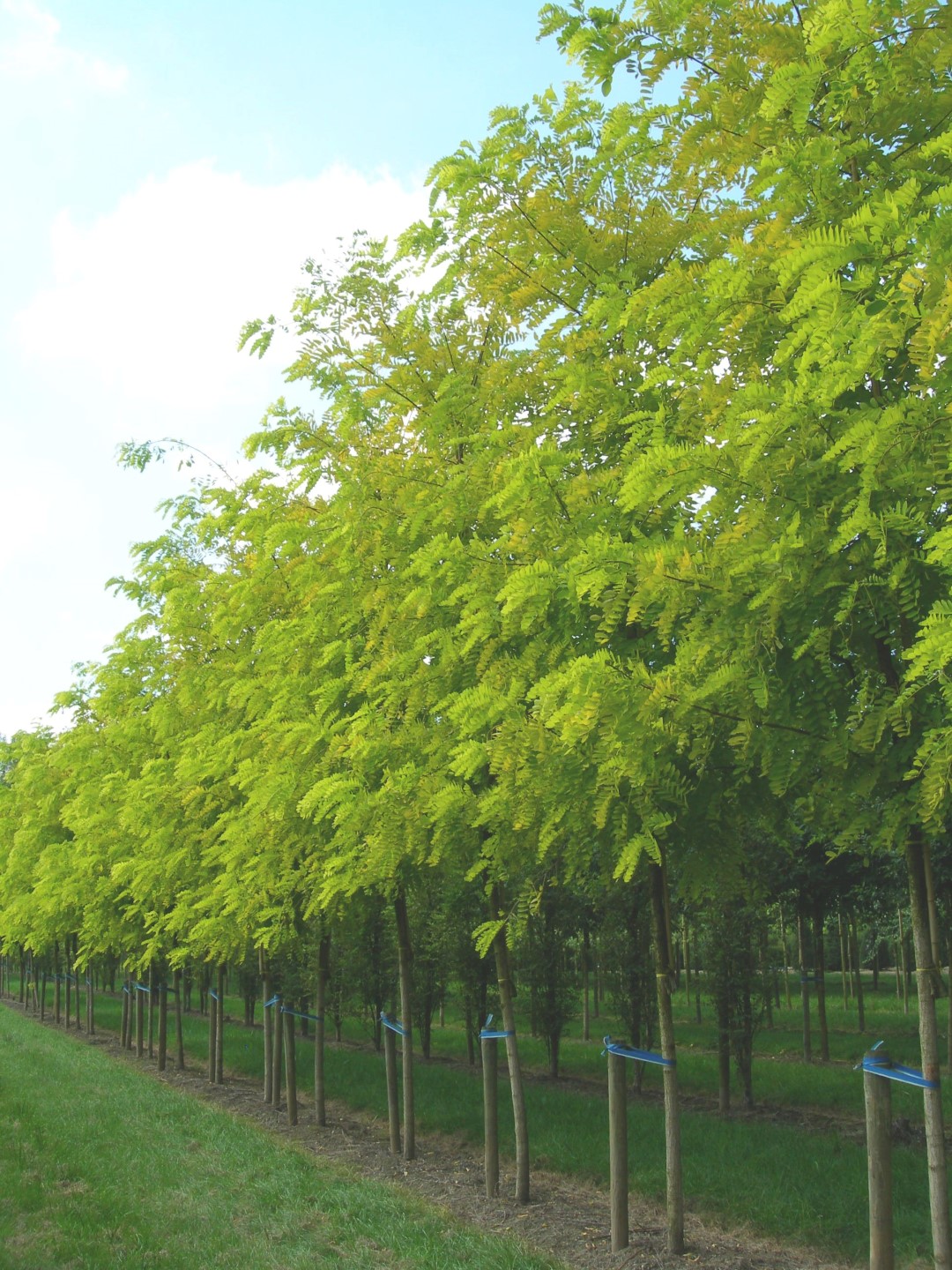 A robustly growing tree, particularly when young, with a relatively narrow, vertical manner of growth. Branches protrude later, so the crown becomes oval to round. Height 12 - 15 m, width approx. 5 - 8 m. The greyish brown bark is rough and deeply grooved. Young twigs are bright brown and have striking wine-red thorns that later turn brown. The compound leaves consist of 9 to 19 elliptical, leaf segments that are 2 – 4.5 cm in size. The leaves have an orange-yellow colour when they emerge, turn greenish yellow in summer, and deep golden yellow in the autumn. 'Frisia' leafs out late and keeps its leaves long into the autumn. Flowers and fruit only rarely appear on the tree. Grows well in light, calcareous soil, has a superficial root system. Given the tree's sensitivity to wind, it should preferably be planted in a sheltered site.