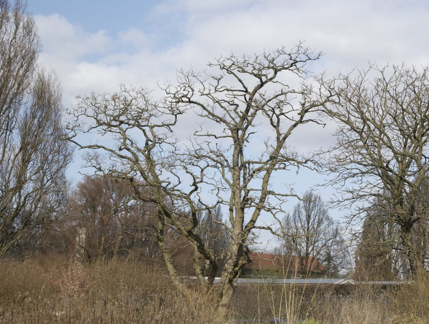 A moderately growing cultivar that is striking because of its twisted branches. Produces a tree 10 - 15 m high with a broad, ovoid to oval crown. Grafted on a high stem, but sometimes also on a low stem to produce a somewhat shrub-like manner of growth. A multi-trunked tree then develops later. The thorny branches grow in remarkable curves: young shoots often grow like cork-screws. The more or less hanging leaves are also somewhat twisted. Flowers appear only occasionally, only on old trees. Sensitive to strong winds. It is a valuable park tree that is used particularly for its winter silhouette. Winter hardiness zone: 5a With its tortuous and spirally twisted branches Robinia pseudoacacia 'Tortuosa' provides an exceptionally characteristic winter silhouette at a later age.