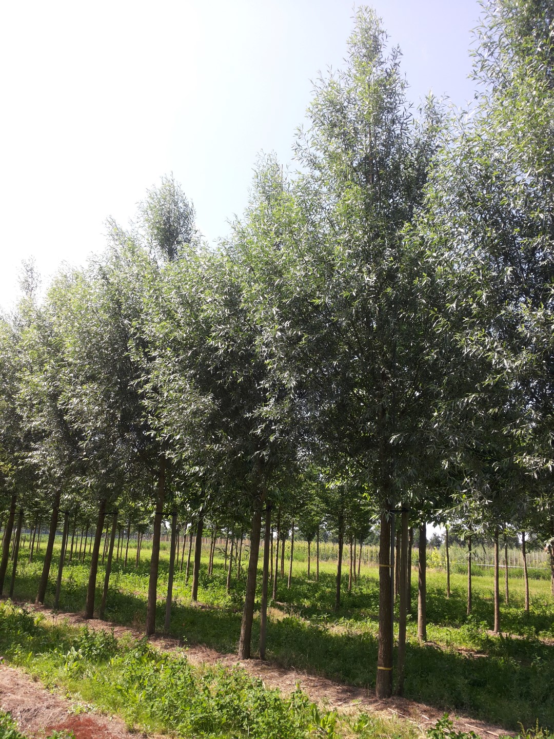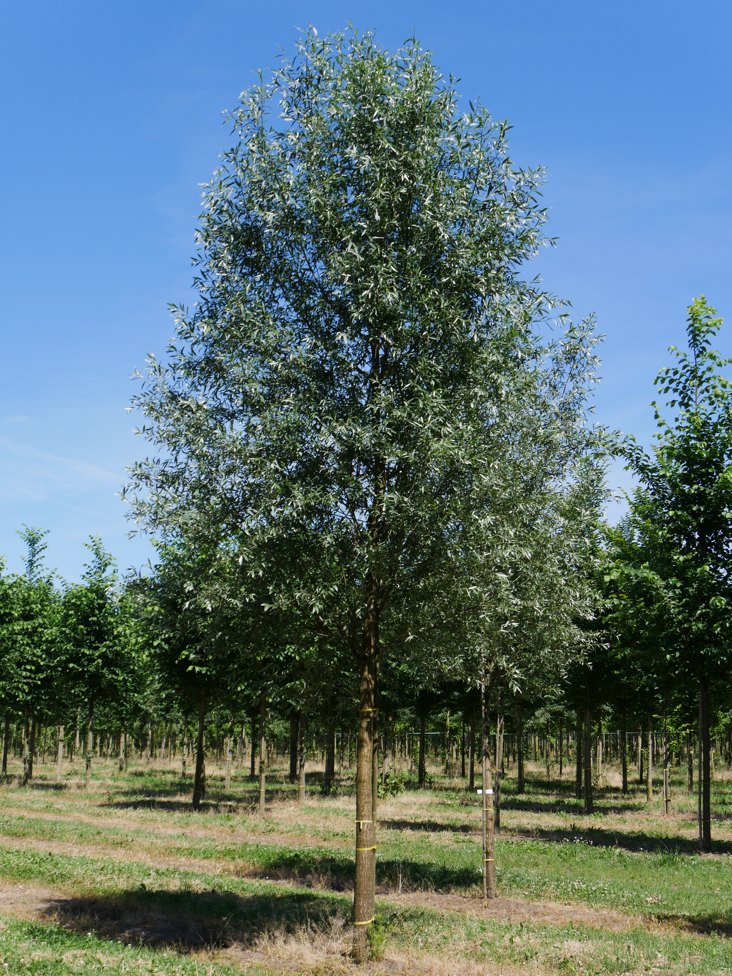 A male cultivar of S. alba with a nice straight to slightly bent trunk and a narrow oval to ovoid crown. Height to approx. 25 m. Often used in landscaping as a pollard willow and then remains significantly lower. The yellowish brown to grey trunk has grooves and is somewhat corky. Young twigs are yellowish brown and very bendable: they are often used for wickerwork and basketwork. The lanceolate leaves are dark green and slightly shiny on top. The leaves are bluish green on the underside. Both sides are slightly hairy with silvery hairs. The yellow catkins appear at the same time as the leaves. Roots grow close to the surface, with very many root-hairs. It grows in moist places and can stand temporary submersion, but also thrives in dryer places. Of the cultivars of S. alba, 'Belders' is the most resistant to watermark disease.