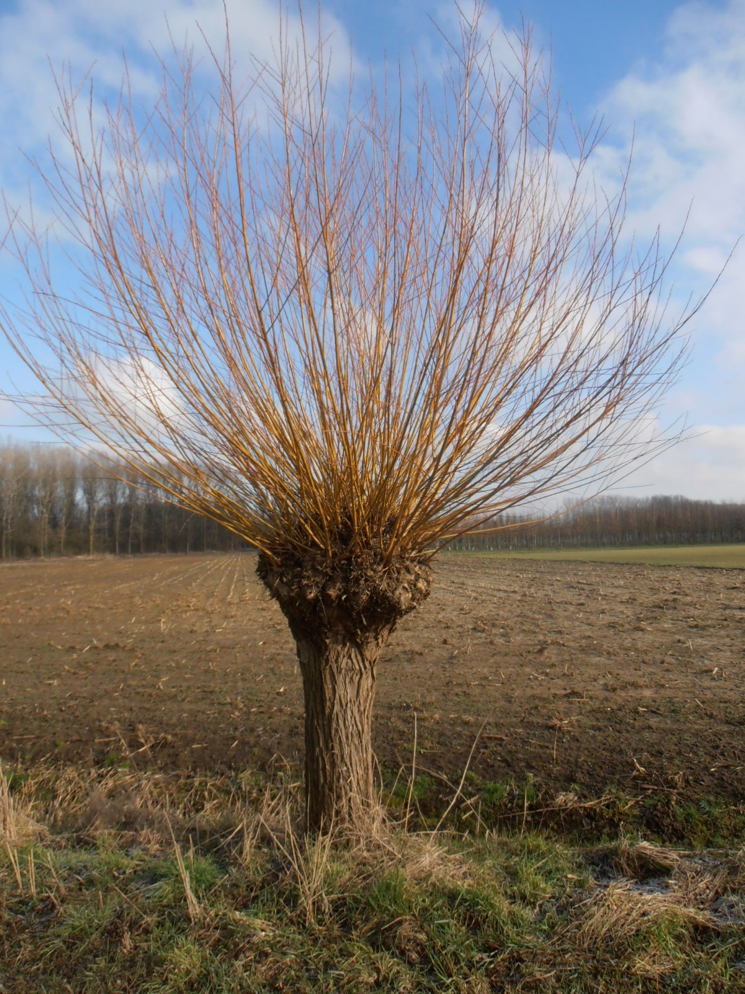 Salix alba 'Chermesina' (syn. S. alba britzensis) is a male cultivar that grows to become a medium-large tree with an approx. height of 10 - 15 m. It is sometimes used as a pollard willow. The trunk has deep, corky grooves. The decorative value of the orange-red to red twigs is striking. 'Chermesina' is a remarkable sight, particularly in the winter months. Frequent pruning stimulates the growth of new, strikingly coloured twigs. The lanceolate leaves are dark green and have silvery hairs. Grows in moist to wet places. Winter hardiness zone: 4