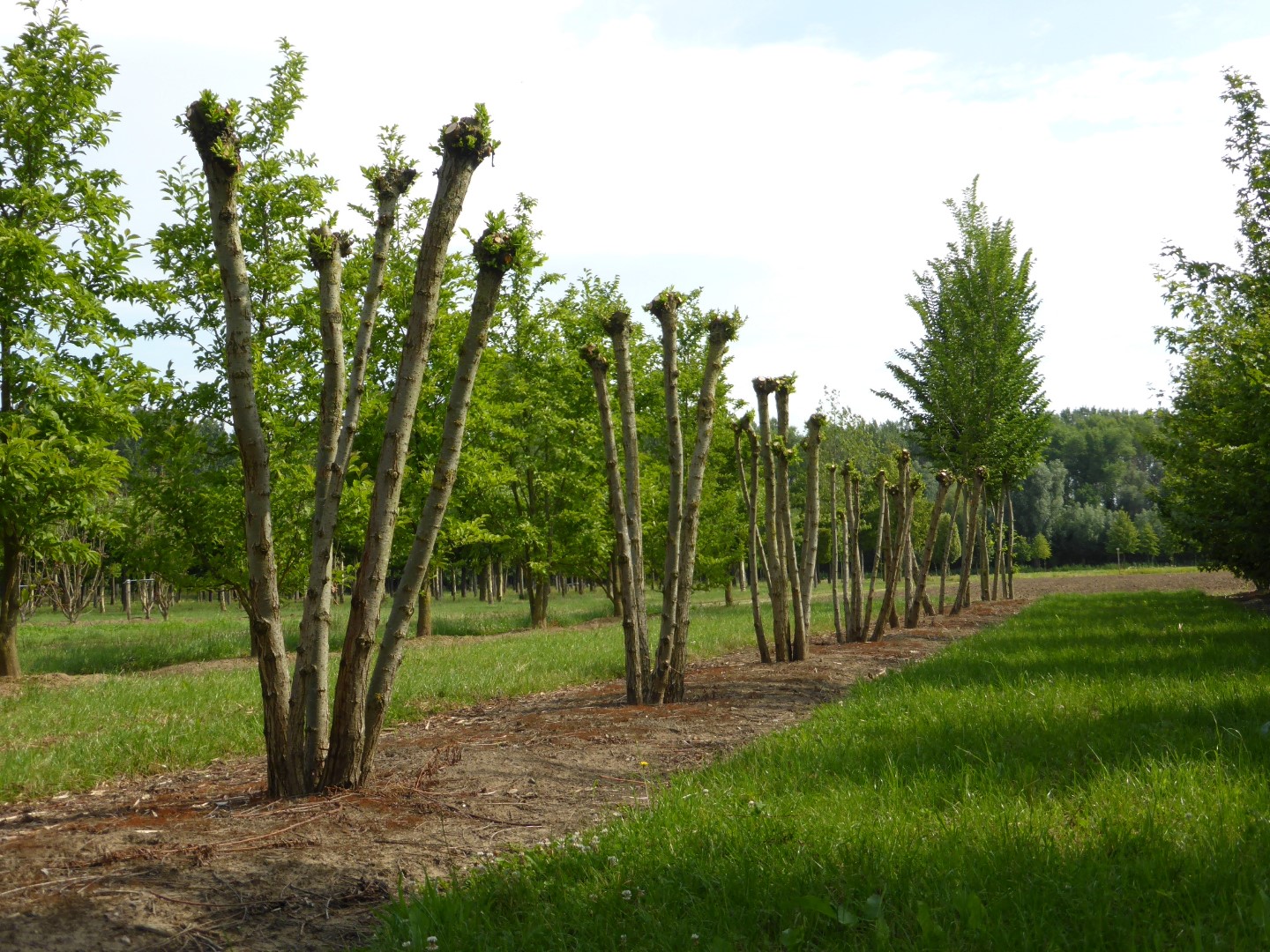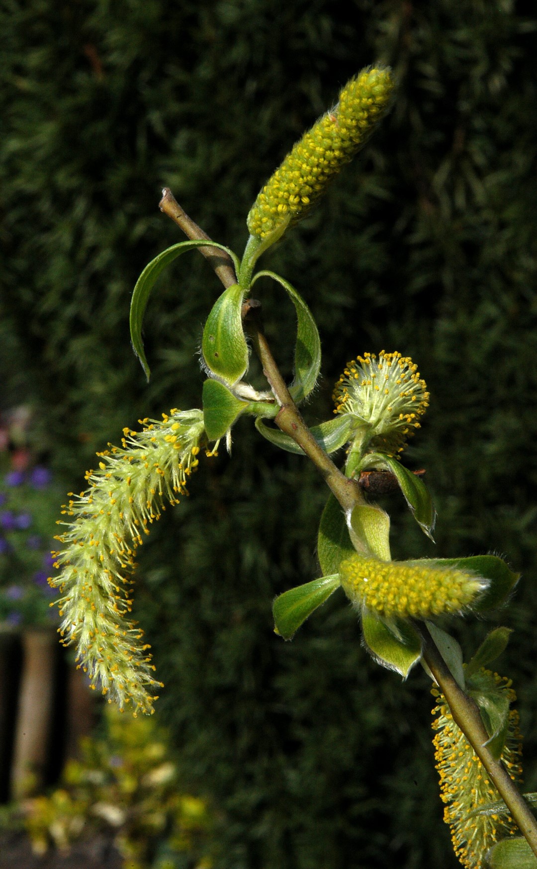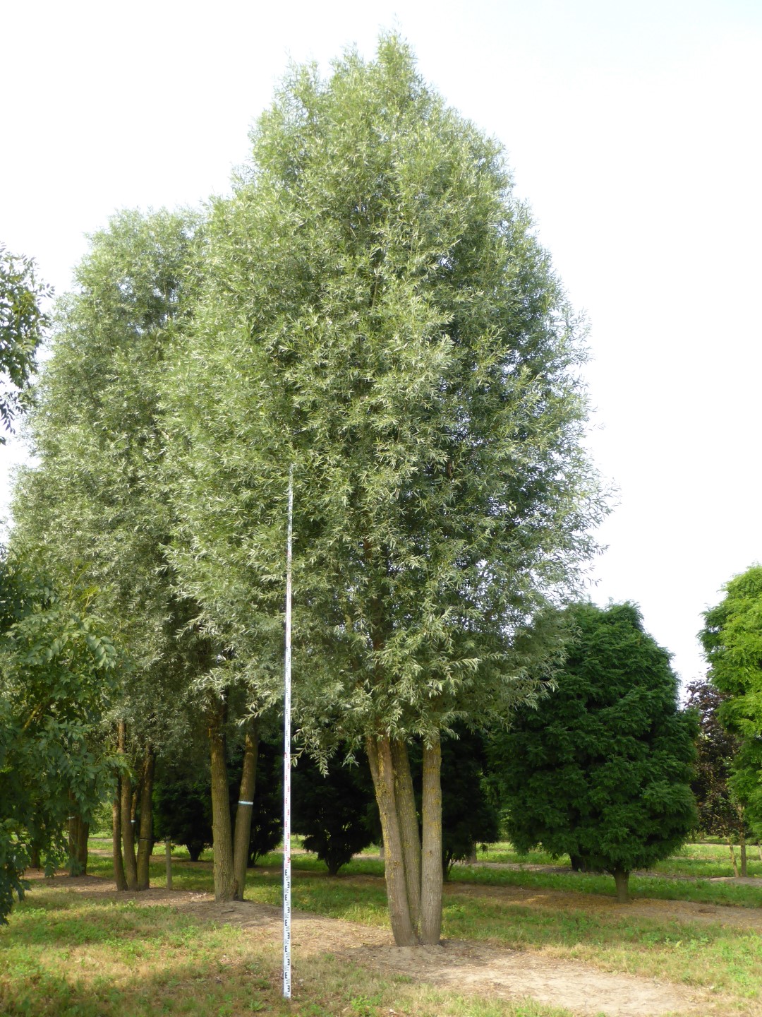 A decorative, fast-growing willow with an oval crown. Becomes broader with pendulous branches at a later age. Often used in landscaping as a pollard willow and then remains significantly lower. The yellowish brown to grey trunk has grooves and is somewhat corky. Young twigs are yellowish brown and very bendable: they are often used for wickerwork and basketwork. The lanceolate leaves are dark green and slightly shiny on top. Underneath they are bluish green. Both sides are slightly hairy with small, silvery hairs. The yellow catkins appear at the same time as the leaves. Roots grow close to the surface, with very many root-hairs. Salix alba is an important supplier of timber for plywood, toys, wooden shoes and crates and has a wide variety of cultivars. It grows in moist places and can stand temporary submersion, but also thrives in dryer places.