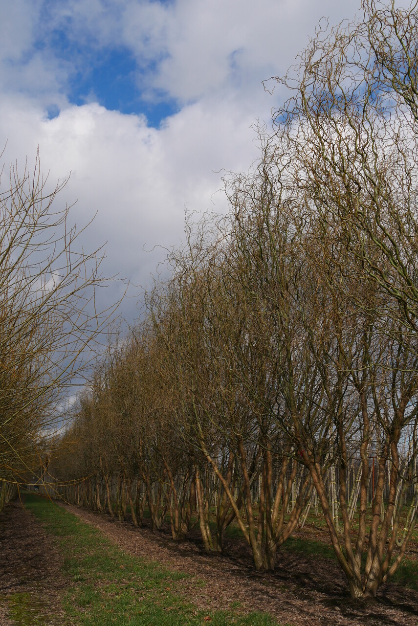 Remarkable tree with very twisted branches, twigs and leaves. Sometimes also cultivated as a shrub. Young trees have an oval crown but as the tree ages, a more round shape develops. When mature, the yellowish grey trunk is deeply grooved. The young twigs twist like a cork screw and are yellowish green. The lanceolate leaves are bright green on top and greyish green underneath. The leaves are 7 - 14 cm long and 1.2 cm wide with a finely serrated edge. The leaves are also very curly, rendering the grey underside very visible. The flowers appear before the leaves emerge. 'Tortuosa' is a decorative tree especially in the winter, with its twisted, yellow branches. The branches are displayed in vases particularly during Easter.