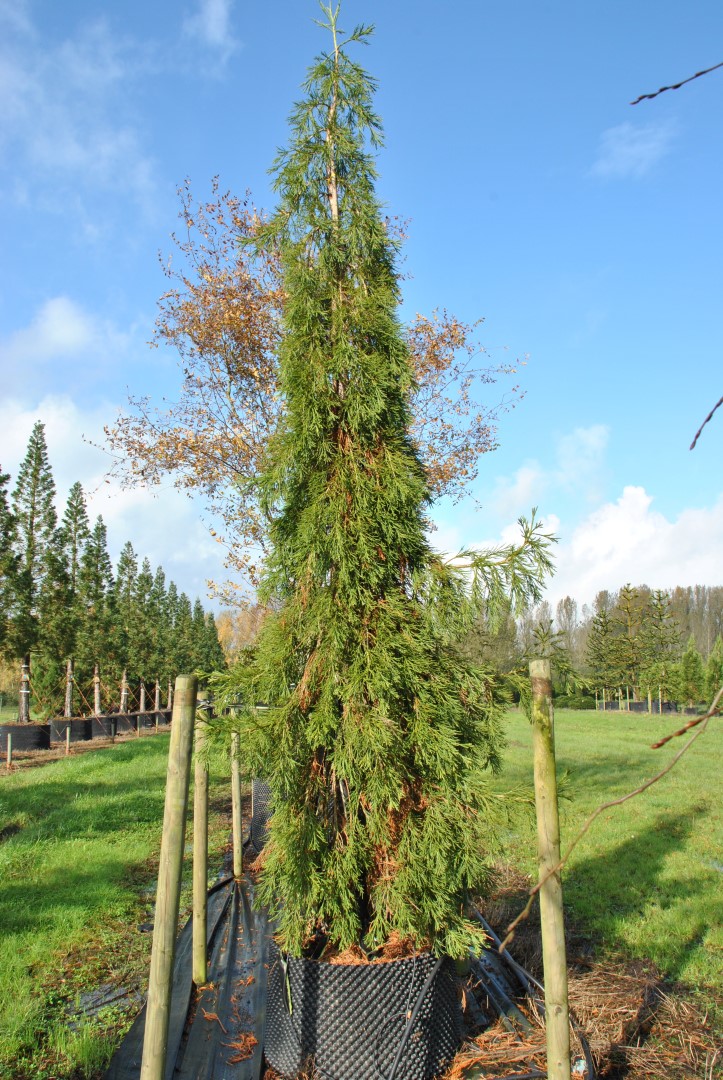 A conifer with a bizarre growth pattern, with branches hanging down sharply, but some grow in a more or less horizontal, undulating pattern. These branches have twigs that hang straight down. The main trunk sometimes grows in an undulating fashion as well. This ultimately produces an exceptional, irregular growth pattern that is pre-eminently suited for solitary planting. The growth pattern is quite similar to that of the cultivar 'Pendulum', however the branches of 'Barabits Requiem' grow more sideways. Height approx. 15 m and width 3 - 4 m. Overfertilisation caused the loss of the original parent tree, discovered by M. Barabits of Sopron, Hungary. Luckily, a few grafting plants were spared, which is why they were named 'Barabits Requiem'. This cultivar is stronger than 'Pendulum' in all respects. The tree is difficult to transplant.