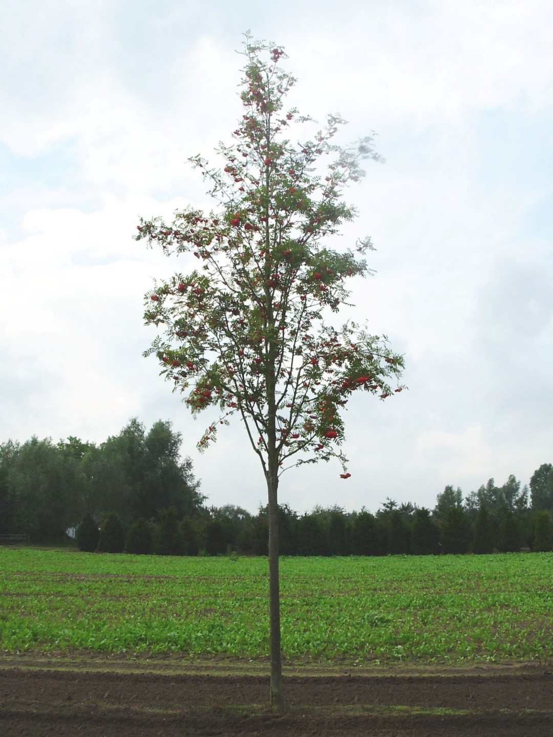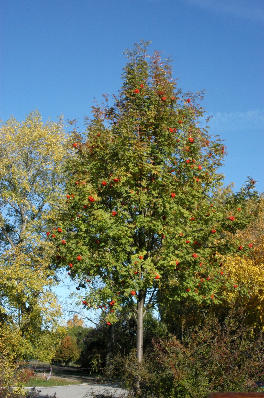 This tree occurs naturally in practically the whole of Europe. It has a broad ovoid crown. In its early years the crown is fairly narrow but broadens out later. Because of its abundant fruit the branches bend, eventually making the crown almost rounded. The smooth trunk is light grey and flakes off somewhat at a later stage. The young twigs are light brown and carry many lenticels. The imparipinnate leaves consist of 9 - 17 (21) elongated leaflets with a roughly serrated edge. The autumn colour is yellow to orange-red. The orange-red to red fruits appear simultaneously with the autumnal colour. Because it makes few demands of the soils this tree occurs in a variety of places, especially in woodland and on wooded banks, where its fruit attracts many birds. Also grows on dry poor soils.
