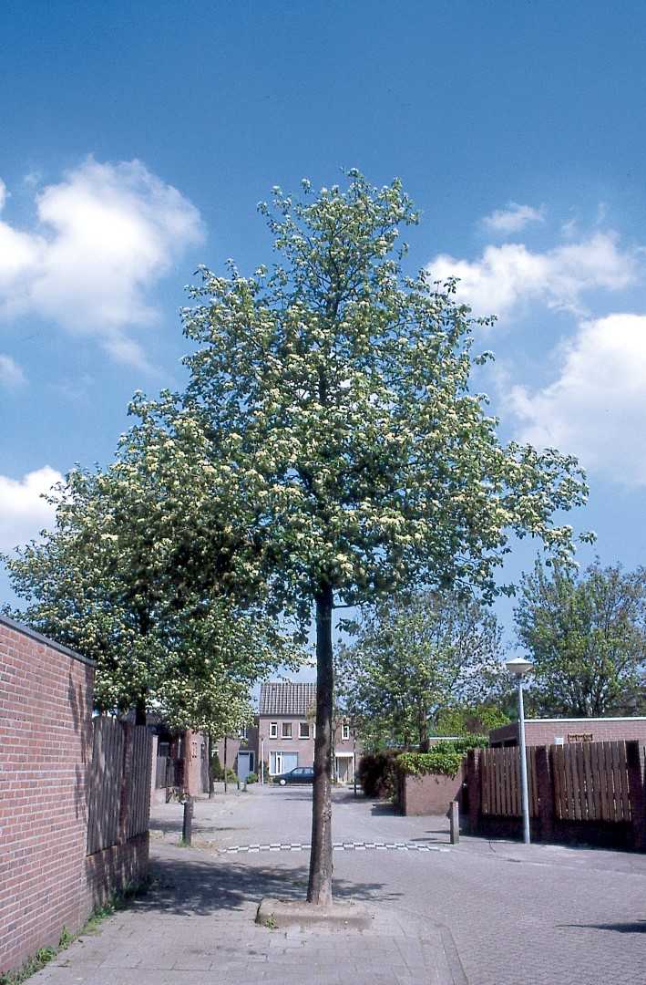 A frequently used, robust and fast-growing cultivar of S. latifolia with a broad pyramidal and remarkably symmetrical crown. Height up to 10 m. The grey trunk is smooth and the young twigs are reddish-brown with white hairs. The broad ovoid to almost round and sturdy leathery leaves are glossy dark green. On the underside they are felt-like and yellowish-grey. The young emerging leaves also bear white felt-like hairs. They remain smaller than those of the species and remain hanging on the tree for a long time in the autumn. In late May the cream-coloured flowers appear and are followed in late summer by numerous brownish-red to orange-yellow fruits. Reasonably resistant to bacterial fire blight and very wind-resistant. Winter hardiness zone: 5a
