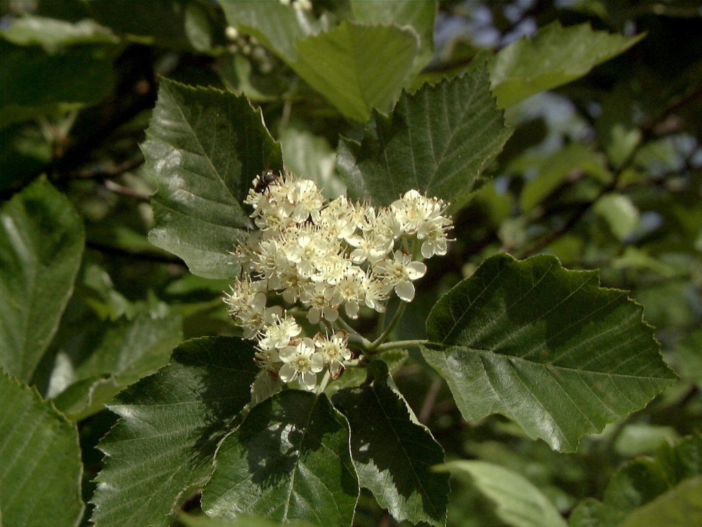 A good Sorbus latifolia selection with a faster growth rate and a narrow pyramidal crown. Height up to 12 m. The trunk is grey and rougher than that of the species: the young twigs are reddish-brown with white hairs. The broad, ovoid to almost round, sturdy, leathery leaves are glossy green and, on the underside, yellowish-green with felt-like hairs. The young emerging leaves also bear white felt-like hairs. The leaves are slightly more broadly serrated than those of the species. In late May the umbels of creamy white flowers appear. In the late summer numerous brownish-red to orange-yellow berries emerge. Fairly resistant to bacterial fire blight. Very resistant to wind. Winter hardiness zone: 5a