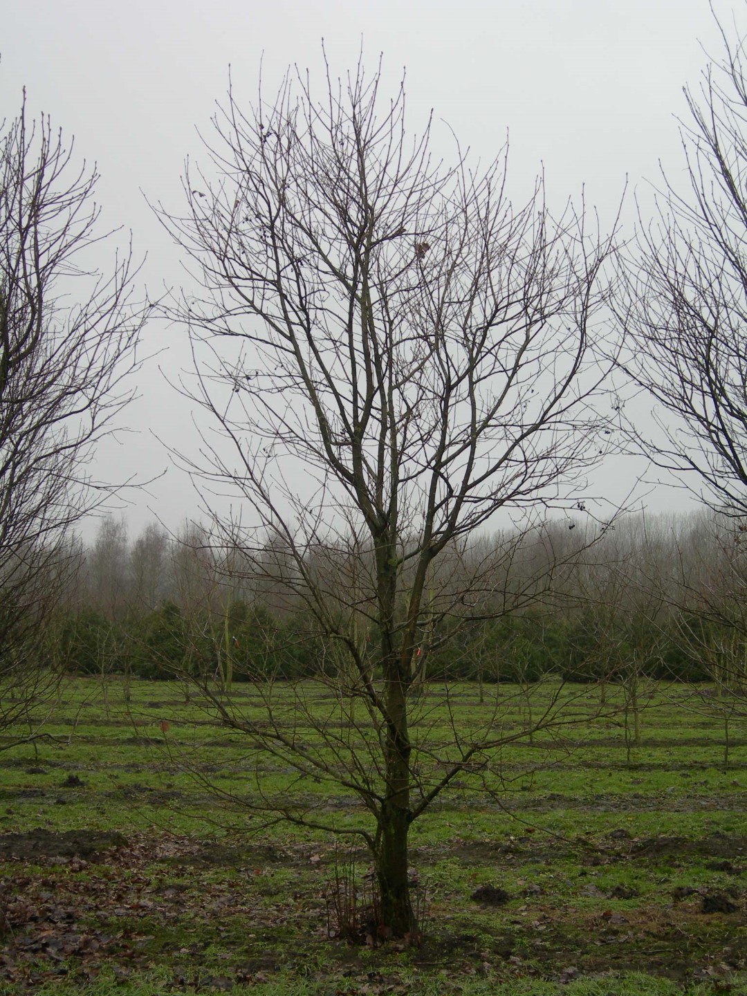 Large tree with a round, open crown. Usually reaches 15 m tall but under very favourable conditions can grow to 20 m. The young twigs have contiguous hairs which it loses after the first winter. The old bark is shed, first in small rectangular plates, later in long, narrow strips. The leaves are glossy green and almost hairless on top. The underside is lighter and hairy. In autumn the leaf turns a lovely red to purplish red. The flowers open in May. They are white with striking yellow anthers and stand in wide corymbs. The oval fruits are brown with light brown lenticels that are visible as light dots. A strong tree that grows in all nutrient-rich and moist soils but also tolerates drier soils.
