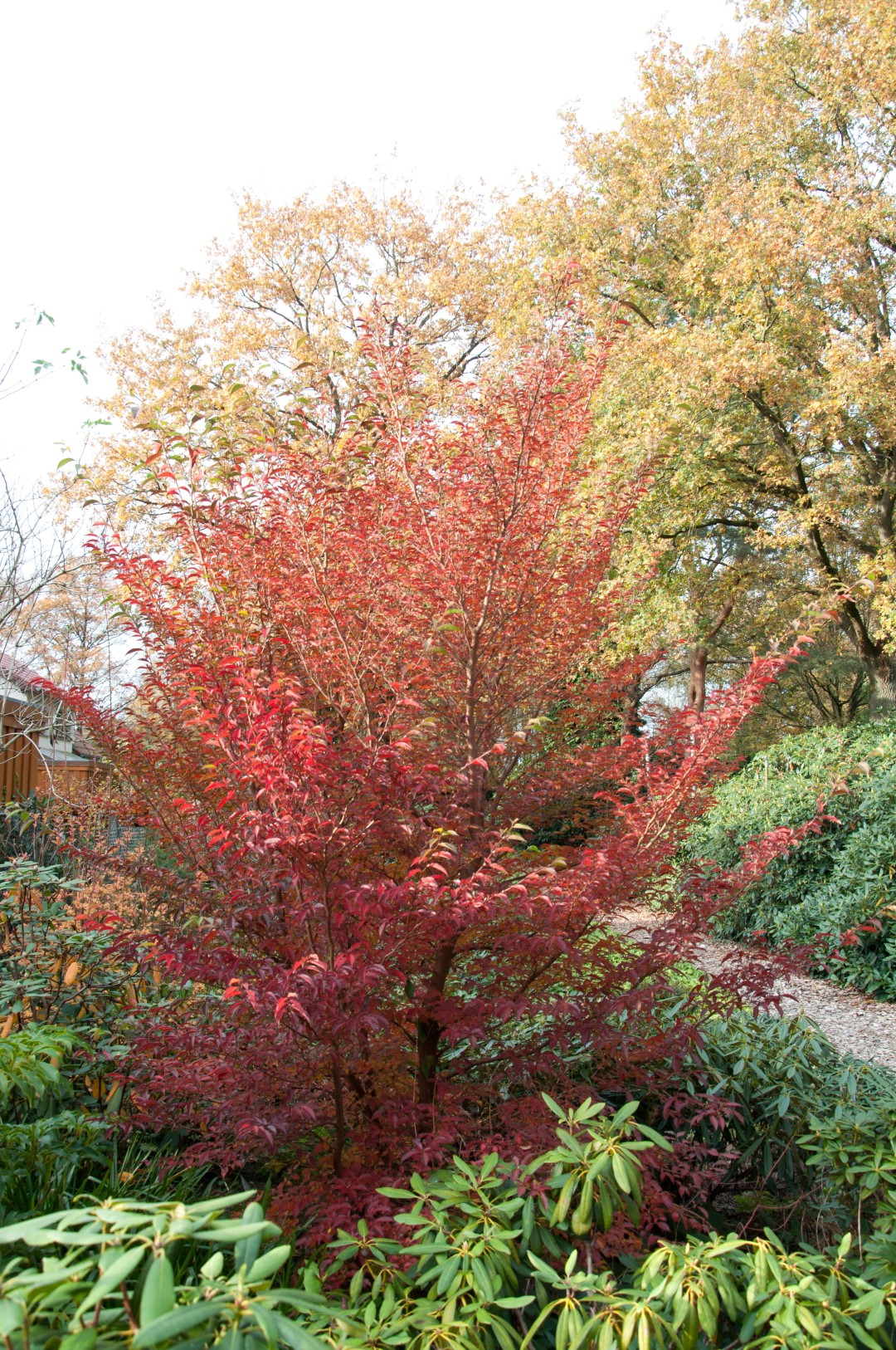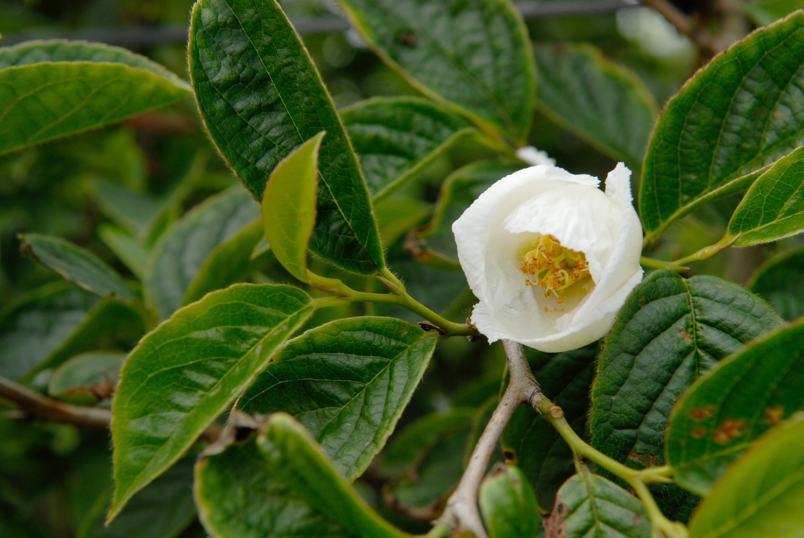 Sturdy shrub to medium-high tree with a broad, pyramidal crown that eventually becomes oval. The smooth bark flakes off in thin, grey, orange- to purplish brown plates. This reveals the remarkable cinnamon-brown bark, creating a decorative picture. The twigs are bare: the dark green leaves are slightly hairy when they emerge. The edge of the leaves are very finely serrated. The tree turns especially lovely colours in the autumn: yellow-red to red-purple tints. The singular flowers, similar to those of Camellia, emerge at the leaf axils. Flowering sometimes lasts into August. The woody fruit capsules, measuring approx. 2 cm, appear following flowering. These burst open at the top in 5 segments containing the practically black seeds. Young plants can suffer damage during severe frost.