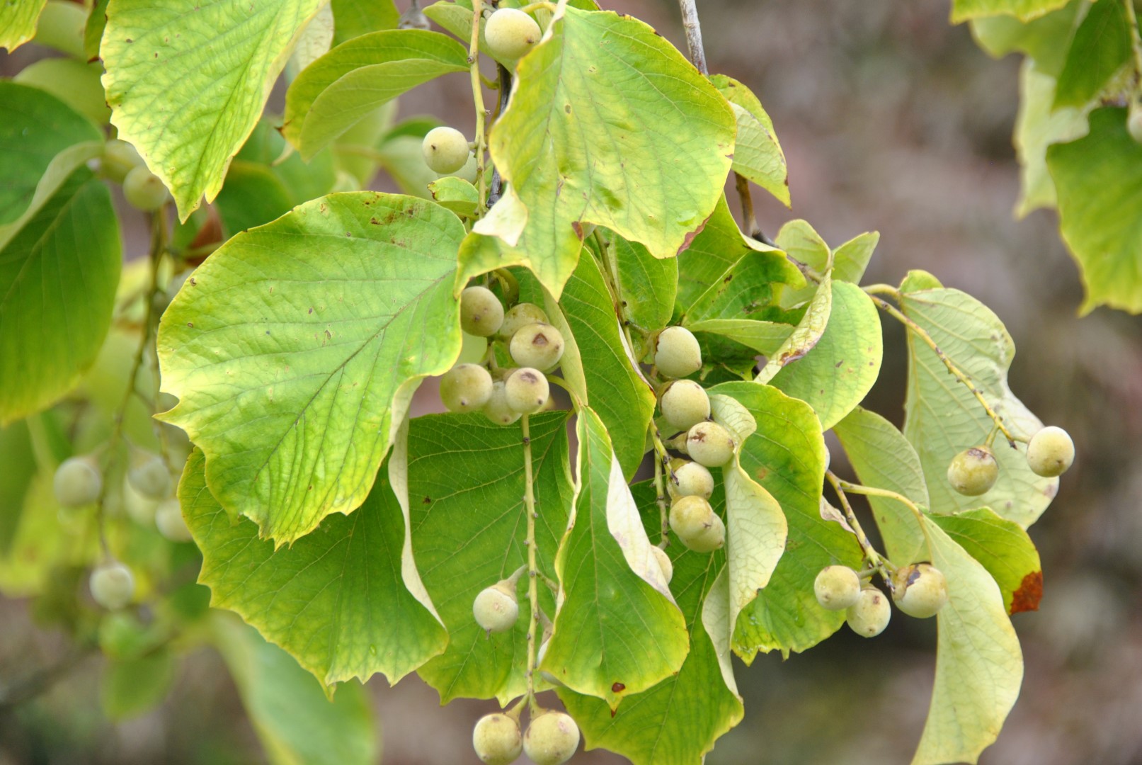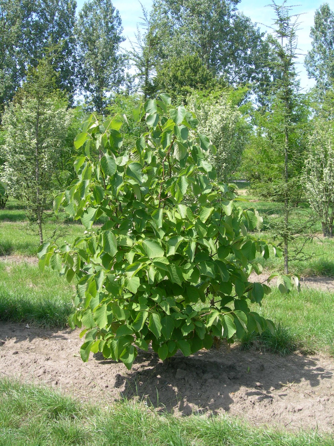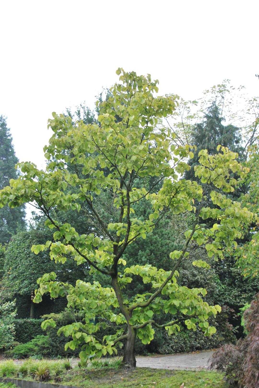 Very large shrub or medium-size to large tree with a broad ovoid to round crown. The young twigs are reddish brown, initially hairy, later turning dark purple and hairless to slightly scaling. The bark of older trees is grey and smooth. The large leaves are almost round with a strikingly pointed tip. They are dark green. The lower two leaves of each shoot are virtually opposite each other. The other leaves are spread along the twig. The leaf base is broad, hollow and encloses the bud. The flowers open in June and hang in long racemes. The individual flowers measure approx. 2 cm and are white with yellow stamens. They have a very strong, pleasant fragrance. The tree usually blossoms very abundantly making it very bee friendly. The flowers are followed by hard, ovoid, white to yellowish hairy drupes with a dark green calyx.