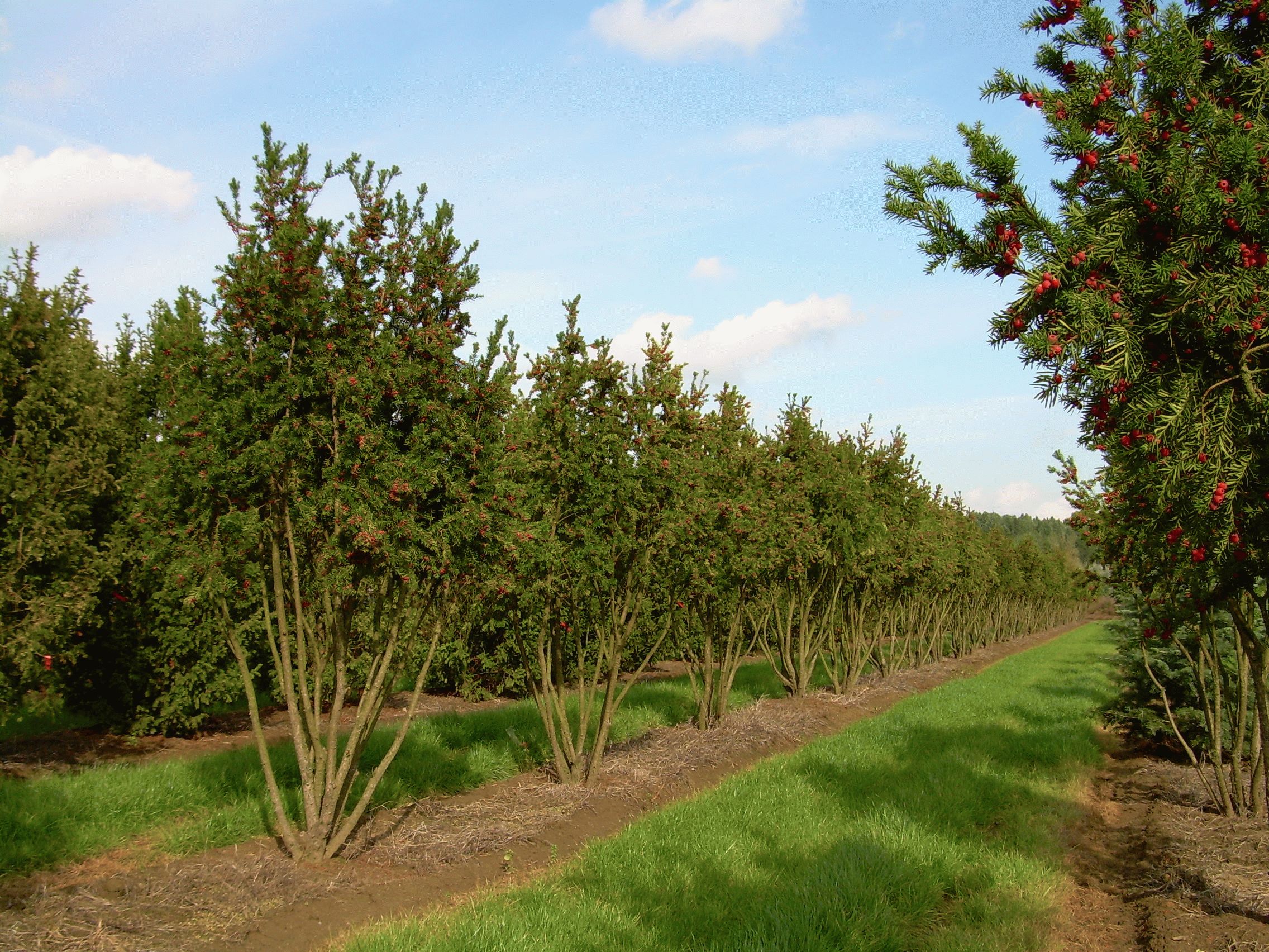Strong Taxus with and upright growing crown of about 3 to maximum 5 m tall and quite dense branching. Initially, ‘Hicksii’ grows almost columnar, the crown later becoming narrow ovoid. The twigs are brown and, typical of this tree, they are fairly strongly undulated. The old bark is reddish brown, flaky and fibrous. On very old trees the bark is grooved. The dark green needles are of average length, but at approx. 0.25 cm wide they are relatively narrow. This female cultivar can bear lots of fruit. This consists of elliptical, brown-black seeds, 4/5 of which is enclosed by a fleshy red aril of about 0.7 cm long. Although suitable as a small tree in a garden or park, ‘Hicksii’ is first and foremost an ideal hedge conifer. As the tree tolerates heavy pruning, it is perfect for hedges and other shapes.