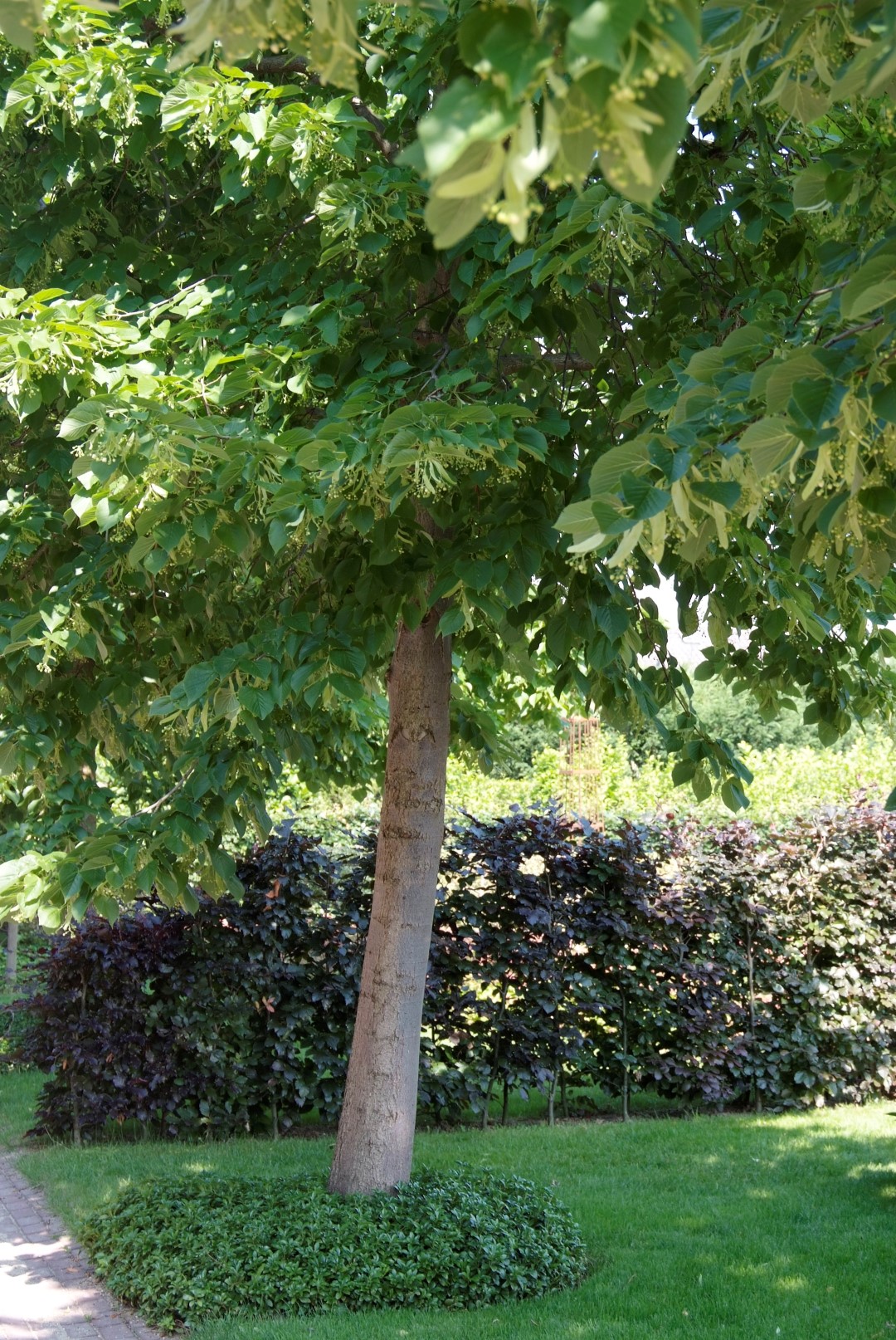 This cultivar attains a maximum height of 25 m and width of approx. 20 m. Young trees have a smooth, grey bark: the bark of older specimens has regular, shallow grooves. Young twigs are smooth and olive green, often reddish brown on the top and side facing the sun. The leaves are remarkably large and taper to an abrupt point at the top. The base of the leaf is a slanted heart shape and the edge is roughly serrated. The upper side of the leaf is dark green while the underside is lighter. Starting in July, umbels of aromatic, pale yellow flowers appear. Individual flowers have an approx. diameter of 1.2 cm. The bract is approx. 11 cm long. 'Nova' has a more narrow, regular crown than the species does, rendering it better suited for use as an avenue tree. Like the species, 'Nova' is susceptible to aphids and the honeydew and sooty mould they produce.