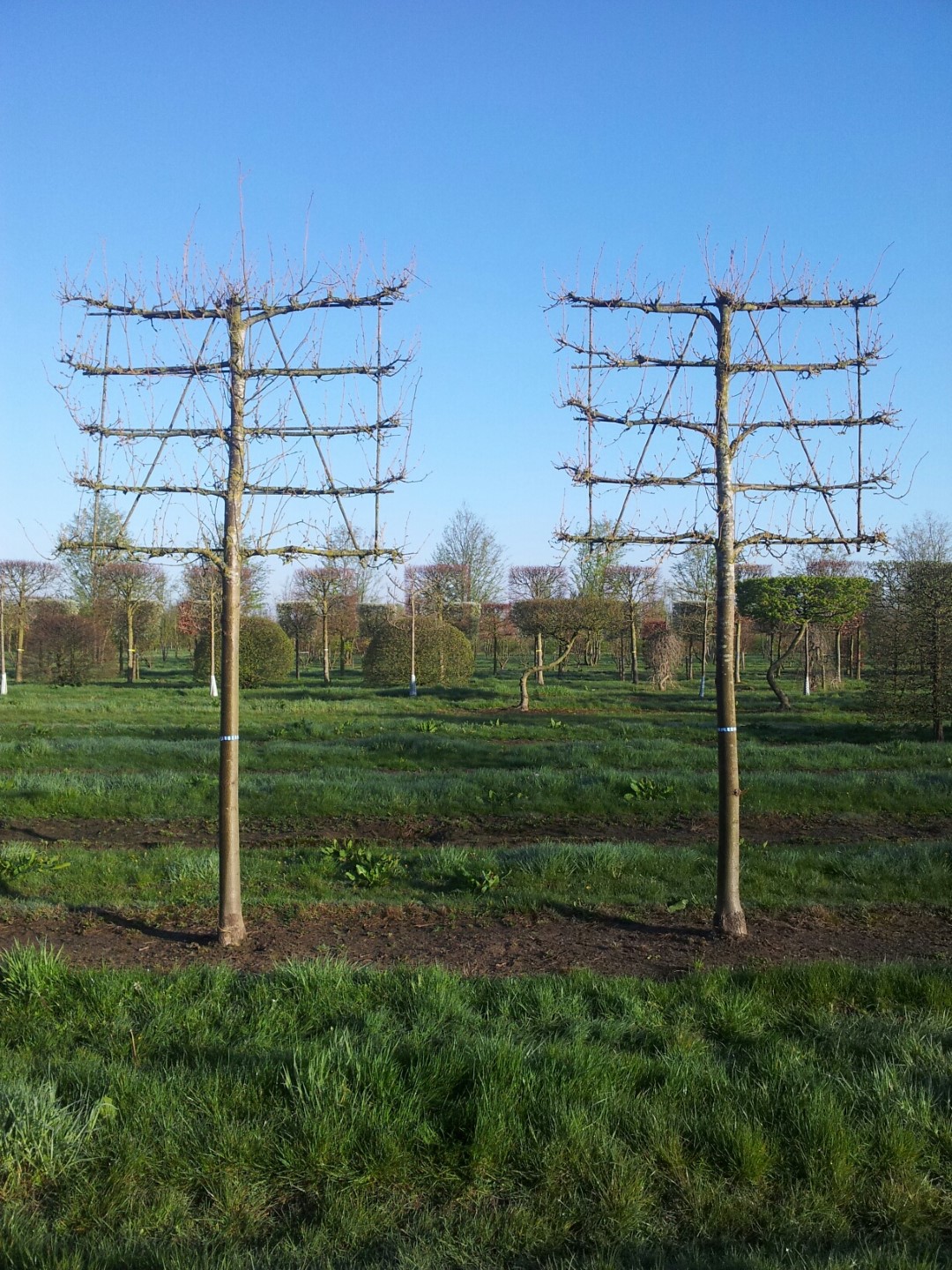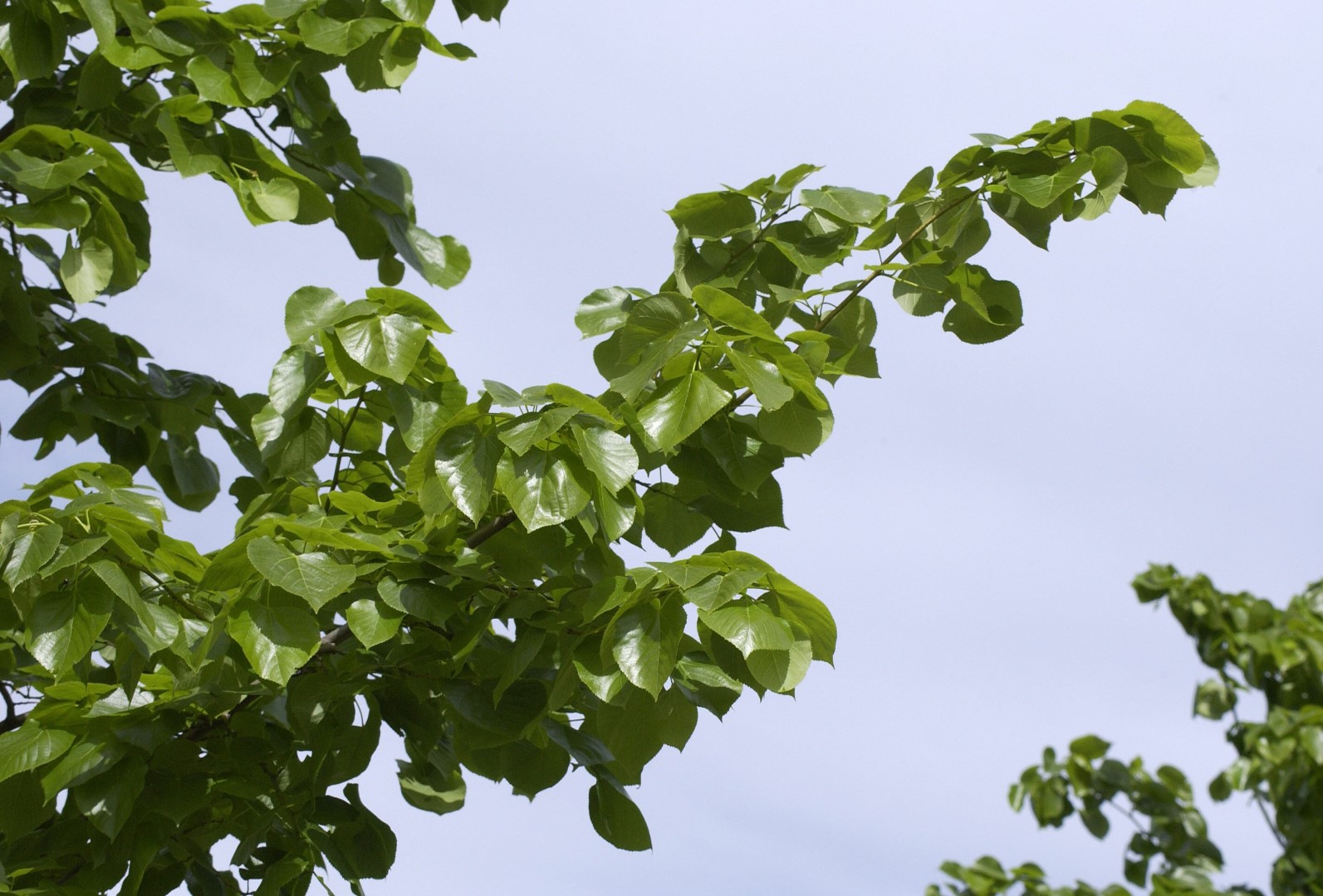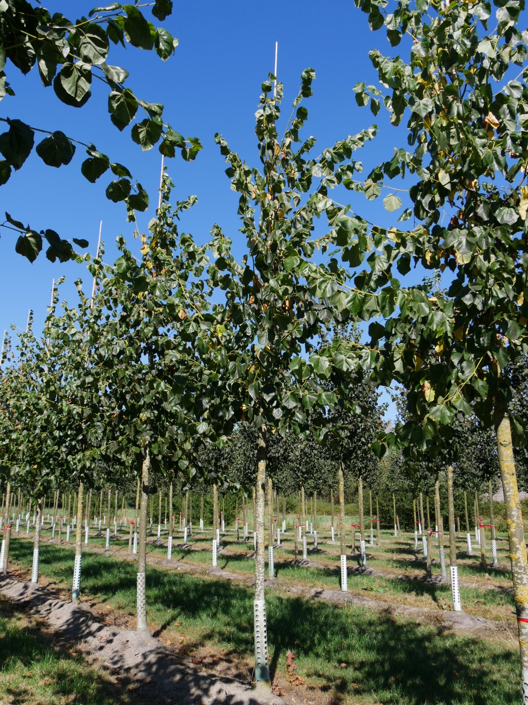 Very probably a hybrid between T. cordata and the rare T. dasystyla from the Crimean. Develops an oval crown with a vertical trunk on which pendulous branches grow. This makes good pruning necessary to guide the tree in its youth. The bark remains thin for a long time, and later develops deep grooves. The leaves have a slanted heart-shaped base and a short, tapered top. The leaf stem is often tinted red and the edge of the leaves is finely serrated. The leaves are light green on the underside. The aromatic flowers appear in pendulous umbels and have particularly abundant honey. 'Euchlora' is one of the best trees for bees. The bract is approx. 6.5 cm long. Owing to its lovely leaves and abundant flowers, 'Euchlora' is a very popular avenue and street tree. A big advantage is that it is not very prone to aphid infestation.