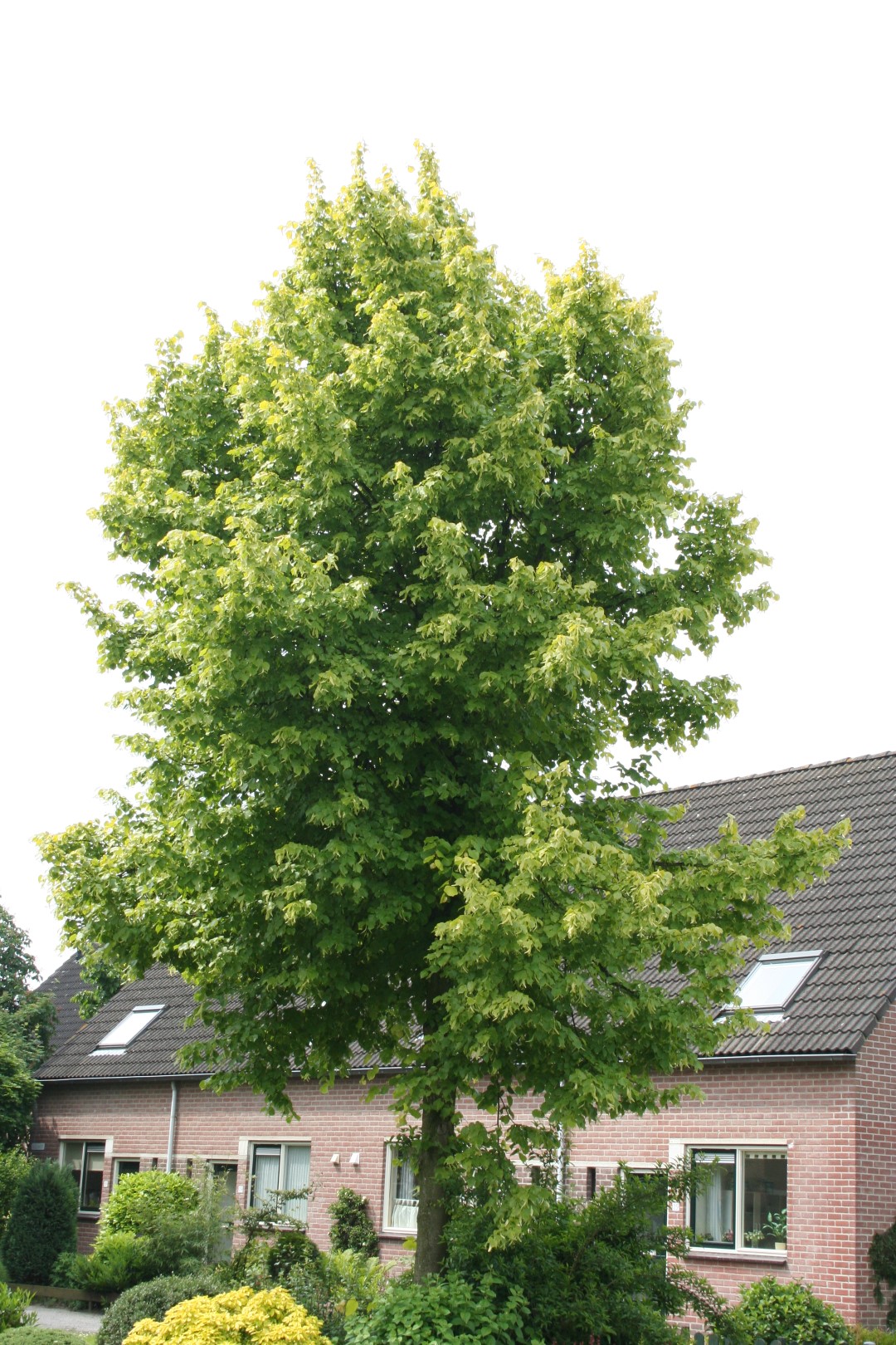 An old cultivar that grows into a large tree with a broad, pyramidal crown. A few very heavy main branches often grow from the heavy trunk and on those irregular lateral branches grow. The bark remains thin for a long time, and later develops deep grooves. The young, emerging leaves have a remarkable bright yellow colour that turns greener later. Due to its light leaves, this tree gives the impression in the summer that it is less than healthy. The autumn colour is orange-yellow to yellow. The large leaves have a short, tapered top and serrated edge. Yellowish white flowers appear in early summer, growing 3 to 11 together in pendulous umbels. 'Wratislaviensis' is prone to aphid infestation, resulting in honeydew and sooty mould.