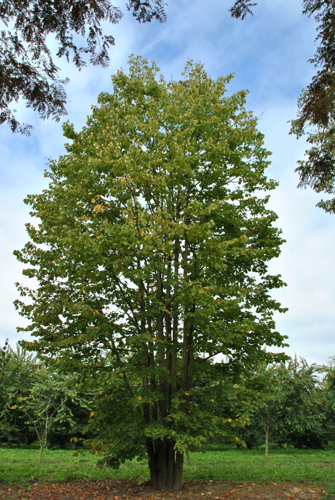 Large tree with practically horizontal branching and a loose, more or less round crown. The bark remains thin for a long time, and later develops deep grooves. Root suckers often grow around the trunk. The branches and young twigs turn dark grey to greyish black. The bare winter buds also turn nearly black. The large leaves have a short, tapered top and serrated edge. They are deep matt green and turn yellow in the autumn. Yellowish white flowers appear in early summer, growing in pendulous bunches. Its broad manner of growth makes 'Zwarte Linde' suitable only for parks and wide avenues. The tree lends itself well for use as an espalier tree, as well. The tree is prone to aphid infestation, resulting in honeydew and sooty mould. It is often used in northern countries thanks to its good winter hardiness.