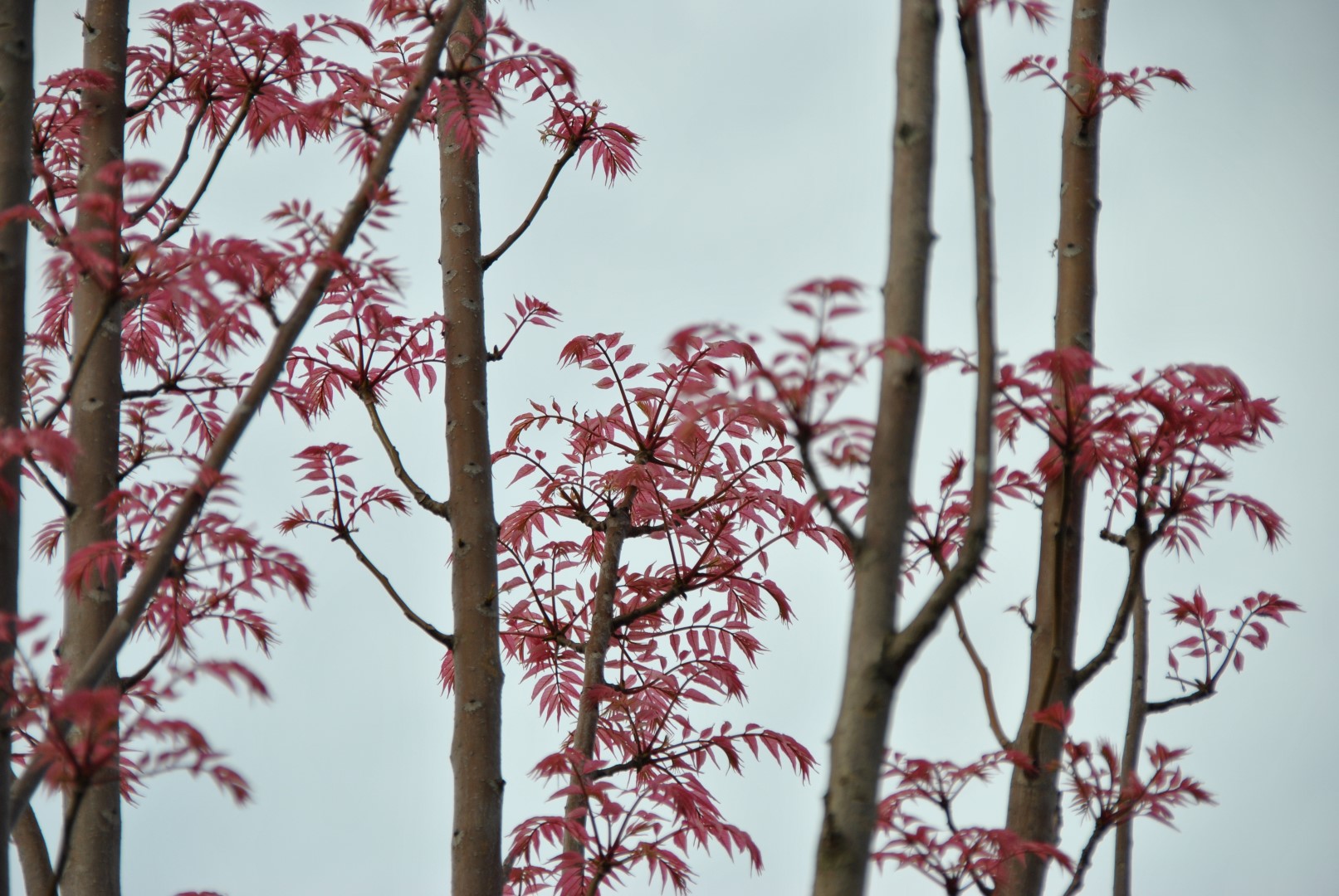 Particularly striking medium-size tree growing to 10 to 15 m. Initially the tree grows slenderly upwards and has a columnar crown. At a later stage the crown spreads. The young twigs are copper-coloured and hairy. The mature bark is grey-brown with longitudinal splits later. When damaged, the bark, branches and leaves smell unpleasant. The large, paripinnate leaf consists of 20 - 26 leaf segments. These are the same shape as the species. On emerging, they are intense orange-pink, turning greenish-yellow and eventually glossy, light green. In autumn the leaf turns yellow. The small, equally unpleasant smelling flowers appear in large panicles. After the blossom, woody capsules form containing winged seeds. The flowers and fruits only appear in hot summers. A special park tree or solitary.