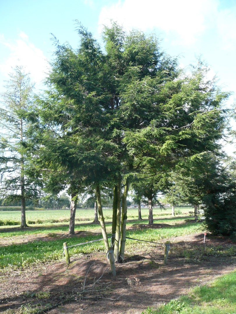 Tree with a nicely vertical main trunk, a height of 15 - 20 m and width of 6 - 8 m. It can reach up to 30 m high in its natural habitat. The branches are perfectly straight on the trunk and the ends hang down. The bark is first smooth and brown, later blackish brown with deep grooves. Young twigs are yellow and hairy like a brush. The needles taper to a point and have a fine, serrated edge. They are approx. 2.5 cm long and 0.15 cm broad. They are glossy green on top, and have 2 light greyish-white stoma stripes underneath. These are highly visible because some needles are twisted, a key difference from T. heterophylla. The needles also often rest on the twig and the needles are a lighter green than those of T. heterophylla. The short-stemmed hanging cones are similar to those of Larix. The needles turn yellow if the soil is calcareous. Tolerates pruning and can be used as a hedge plant.