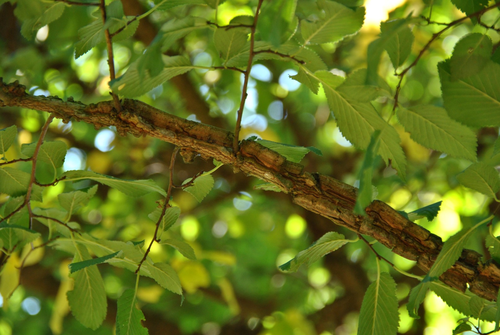 Vigorously growing large tree with a dense, broad oval crown. The brown twigs have striking corky fissures. The old brown-grey bark is deeply grooved and blocky, and has cork deposits. The leaf is oval-elongated to obovate. Young leaves are rough and hairy, adult leaf is bare and glossy green. The base of the leaf is crooked, a feature of most elms. The leaf margin is double serrated. The small green-purple flowers are in dense clusters of 15 - 30, appearing in March, before the leaf development. The seeds enclosed in their wing are often formed before the leaf development too. First they are green but turn brown later. Low resistance to Dutch elm disease but of very great landscape value. Tolerates a lot of wind, including sea wind.